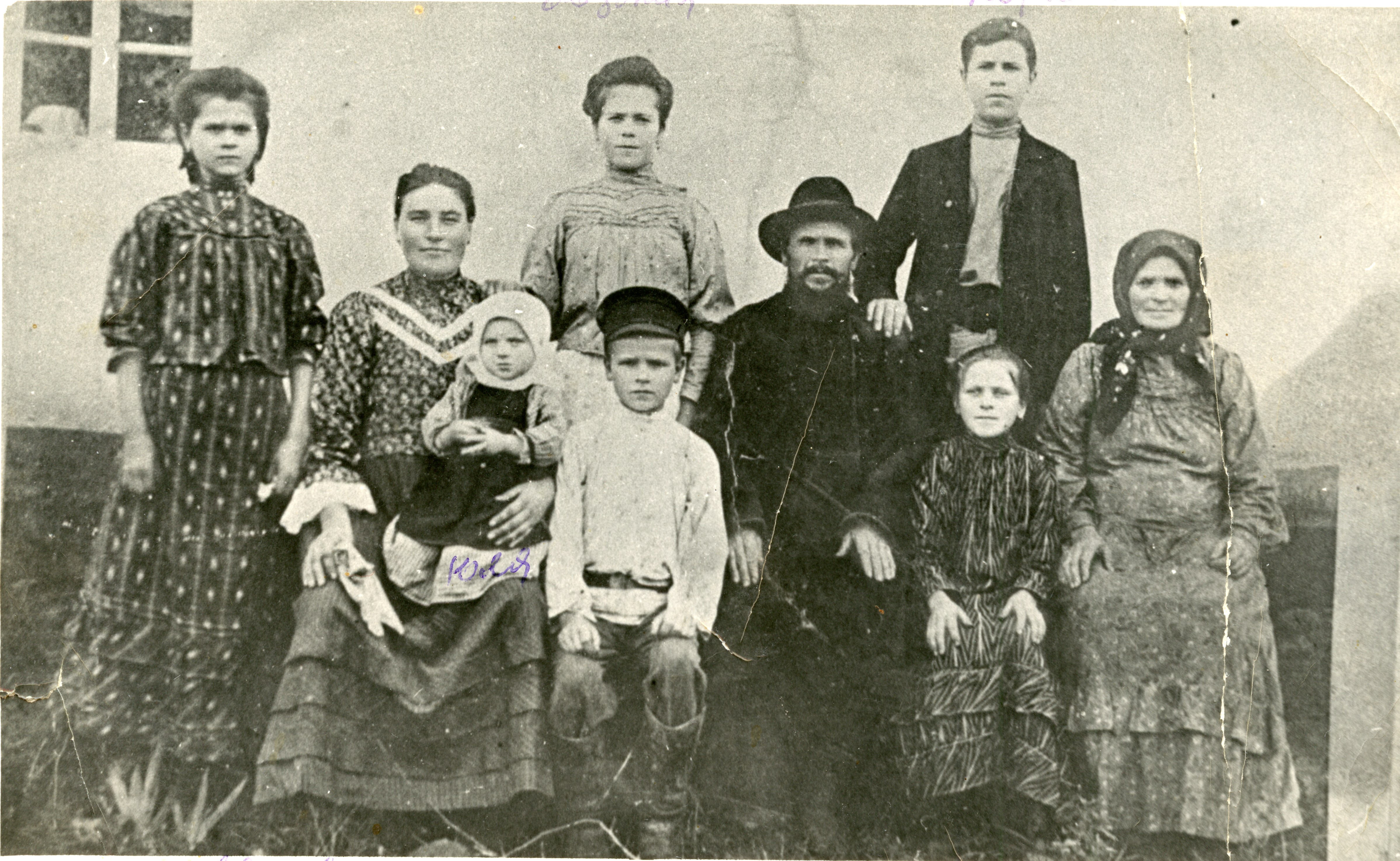 ```plaintext Gemini, please process the following photograph with your advanced capabilities: 1. RESTORE: Address physical damage in the image, including the prominent scratches and stains across the image, particularly in the upper portion and central areas. Remove any evidence of fading and mold, restoring clarity to the entire image. 2. ENHANCE QUALITY: Sharpen the image to capture micro-details in hair, fabric textures, skin, and eyes. Enhance the tonal contrast and dynamic range to recover lost details in shadows and highlights. Reduce film grain while maintaining a natural texture throughout the photograph. 3. COLORIZE: Apply historically accurate and photorealistic colors as follows: - Skin tones should be natural warm beige, reflecting realistic hues of humans and avoiding red, orange, or pink tints. - Use muted, desaturated colors reminiscent of a genuine color photograph from that era, ensuring all fabric, nature, and architectural elements appear in subdued tones. Image details: - There are nine people in the image: - Back row (left to right): Three females are standing, dressed in patterned dresses or blouses. - Front row (left to right): One adult female wearing a darker patterned dress, holding a baby. A young boy wearing a cap, standing next to a seated man with a beard and hat, dressed in dark clothing. Next to him, a young girl is sitting, and two women, one dressed in a patterned scarf, are at the end. - The setting appears to be a rural, early 20th-century environment. Ensure the clothing reflects this time period with appropriate color tones: muted blues, browns, and greens. Hair colors should appear natural: dark brown, black, or similar authentic shades. Apply these instructions carefully to achieve a restored, visually enhanced, and accurately colorized photograph. ``` ABSOLUTE RULES — NEVER VIOLATE: - DO NOT add, invent, or hallucinate any part of the image that is not in the original - DO NOT change the framing or composition — keep it exactly the same - DO NOT add any new damage, folds, creases, tears, dark borders, vignettes, or artifacts - DO NOT change, replace, or alter any person's face, body, or identity - DO NOT add or remove any person or object - DO NOT modernize clothing, hairstyles, or any visual elements - Keep the exact same framing, crop, and aspect ratio as the original - SKIN TONES: warm ivory/light tan — NEVER red, NEVER orange, NEVER pink - All colors MUTED and DESATURATED — real analog film, NOT vivid digital - Apply uniform sharpness to the ENTIRE image — NO background blur