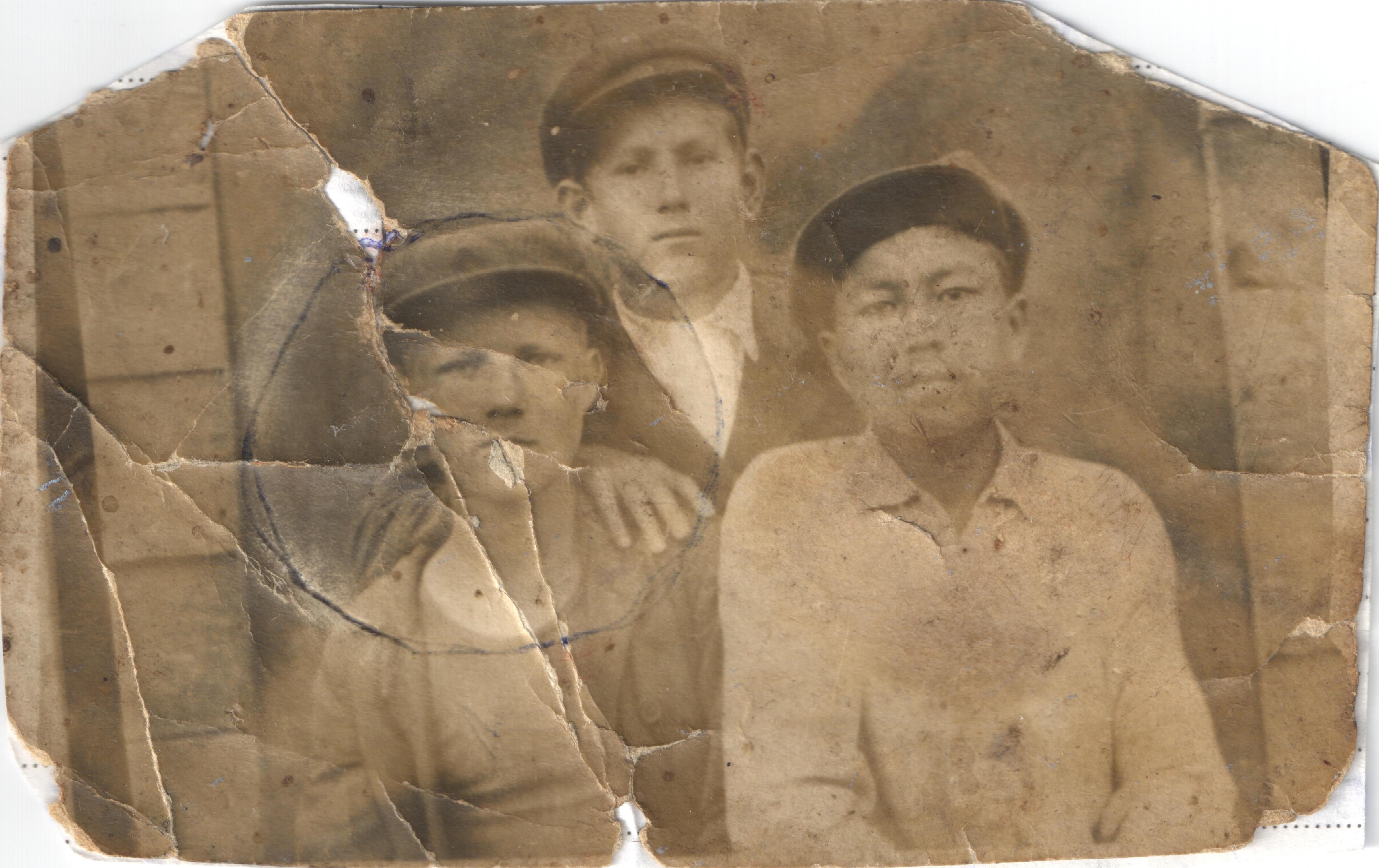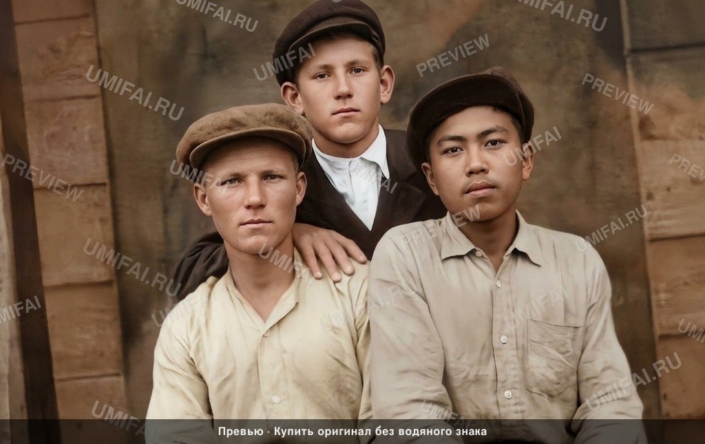 IDENTITY LOCK — NON-NEGOTIABLE: The people in this photo MUST remain the EXACT same individuals — same facial bone structure, same eye shape, same nose, same mouth, same chin, same age, same expression. DO NOT regenerate any face. DO NOT add wrinkles, age lines, under-eye bags, or any aging not visible in the original — a young face must stay young. Skin must NEVER appear red, pink-red, orange, flushed, or sunburnt. A different-looking person in the output = total failure. Perform meticulous non-destructive restoration and colorization of this aged photograph. Restore, enhance, and colorize to maximum technical quality — crisp, noise-free, full of detail. Add historically accurate colors. Output MUST have the EXACT same aspect ratio as the input. Colorize the EXISTING photograph using ...