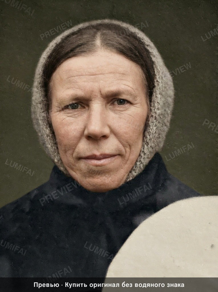 - **SHARPNESS:** Apply uniform sharpness. The texture of the headscarf (platok) and the background grain must be as crisp as the facial features.