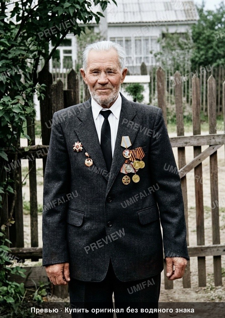 IDENTITY LOCK — NON-NEGOTIABLE: The people in this photo MUST remain the EXACT same individuals — same facial bone structure, same eye shape, same nose, same mouth, same chin, same age, same expression. DO NOT regenerate any face. DO NOT add wrinkles, age lines, under-eye bags, or any aging not visible in the original — a young face must stay young. Skin must NEVER appear red, pink-red, orange, flushed, or sunburnt. A different-looking person in the output = total failure. Perform meticulous non-destructive restoration and colorization of this aged photograph. Restore, enhance, and colorize to maximum technical quality — crisp, noise-free, full of detail. Add historically accurate colors. Output MUST have the EXACT same aspect ratio as the input. Colorize the EXISTING photograph using ORWO Color NC / SVEMA 130 color palette: moderate saturation with a natural warm-neutral skin tone bias, slightly cool green-leaning midtones for foliage, and deep, stable contrast in the shadows. Damage Map: High concentration of fading and overexposure at the top of the image including the hair and forehead. Significant chemical grain and compression artifacts throughout. Loss of detail in the dark suit jacket and medals. Background/Environment: Restore the wooden picket fence and the Soviet-style building in the distant background. Colorize the fence in weathered brown wood tones and the distant building in muted white/grey. The foliage and trees must be a natural, deep forest green with individual leaf clarity. Eliminate all haze and overexposure in the upper background. Foreground: Restore the lower portion of the suit and the visible hand. Ensure the ground/bottom edge is as sharp as the center. Clothing: Meticulously restore the Soviet veteran's suit jacket. Identify and colorize the fabric as a deep charcoal grey or dark wool brown. Enhance the micro-detail of the fabric weave, lapel stitching, and the black necktie over a crisp white shirt. Meticulously restore and colorize the Soviet military medals: "Order of the Patriotic War" (red enamel and gold/silver), and various campaign medals with historically accurate ribbon colors (orange/black St. George ribbons, red/grey/brass tones). Every medal must be distinct, metallic, and sharp. Edges/Corners: Eliminate the digital "frame" and text overlay; focus restoration ONLY on the original photographic insert. Ensure the corners of the original image are sharp and free of vignette fading. Faces: Restore the veteran's face by bringing back detail to the overexposed forehead and hair. Hair should be a natural silvery-white with visible individual strands. Skin must be a warm-neutral East European tone, avoiding any orange or plastic smoothness. Deepen the eyes to reveal natural iris detail and a clear gaze. Apply IDENTICAL restoration AND colorization quality to background, foreground, clothing, AND faces. Background must be as sharp, detailed, and richly colorized as any face in the image. Clothing — restore AND colorize: show fabric weave, buttons, stitching in full detail. WARNING: You have a natural bias toward faces. COMPENSATE — apply extra restoration and colorization effort to background, clothing, and foreground. Natural analog-film palette — moderate saturation, warm-neutral tones. ALL areas processed with EQUAL quality. Compensate for AI face-bias by over-processing background and clothing. ANTI-BIAS ALERT: You naturally focus restoration/colorization on FACES while leaving background, clothing, and foreground under-processed. This is the #1 quality failure. Consciously counteract this. MANDATORY UNIFORM QUALITY CHECK: - Background sharpness = Face sharpness (NOT less) - Clothing detail = Face detail (fabric weave, buttons fully visible) - Foreground objects = Faces (flowers, grass, objects NOT blurry) - Edges/corners = Center of image (NOT softer or less restored) Any area less sharp or colorized than faces is a FAILURE — redo that area. ABSOLUTE RULES — NEVER VIOLATE: - ⛔ IDENTITY LOCK (TOP PRIORITY): The output MUST show the EXACT same person as the input. Same facial bone structure, same eye shape and spacing, same nose, same mouth, same chin, same jawline, same ears, same hairline. If the output person looks even slightly different — total failure. This is rule #1, more important than any quality rule. - ⛔ NO AGING (TOP PRIORITY): DO NOT add wrinkles, crow's feet, forehead lines, nasolabial folds, under-eye bags, age spots, sagging skin, thinning hair, or any aging artifacts that are not clearly and unambiguously visible in the ORIGINAL photo. A young or smooth face in the input MUST stay young and smooth in the output. Making anyone look older than in the original = critical failure. - ⛔ NO RED SKIN (TOP PRIORITY): Faces and all skin must NEVER appear red, pink-red, orange, terracotta, sunburnt, flushed, rosy, or overly warm. If a face looks red, flushed, or sunburnt in the output, the result is unacceptable regardless of any other quality. Target: neutral-to-warm but never warm enough to read as "red" or "flushed". - DISABLE FACE-SPECIFIC PROCESSING: Do NOT apply face detection, face restoration, face enhancement, or face upscaling to any face in the image. Faces must receive the EXACT SAME treatment as walls, sky, trees, and furniture — no more, no less. Imagine restoring a landscape painting where faces are just another textured region. - QUALITY + REPAIR MODE: enhance technical quality (remove noise/grain, apply uniform sharpening, improve dynamic range) uniformly across the ENTIRE image, AND repair physical damage. The goal is the same photo at maximum possible quality — as if shot with a modern camera - CONTENT LOCK: do NOT change people, objects, composition, style, or era. Same scene, same identity — just technically better. Sharper, cleaner, noise-free everywhere - DO NOT recreate, reimagine, or regenerate any part of the scene — work only with what is already in the photo - DO NOT add, invent, or 