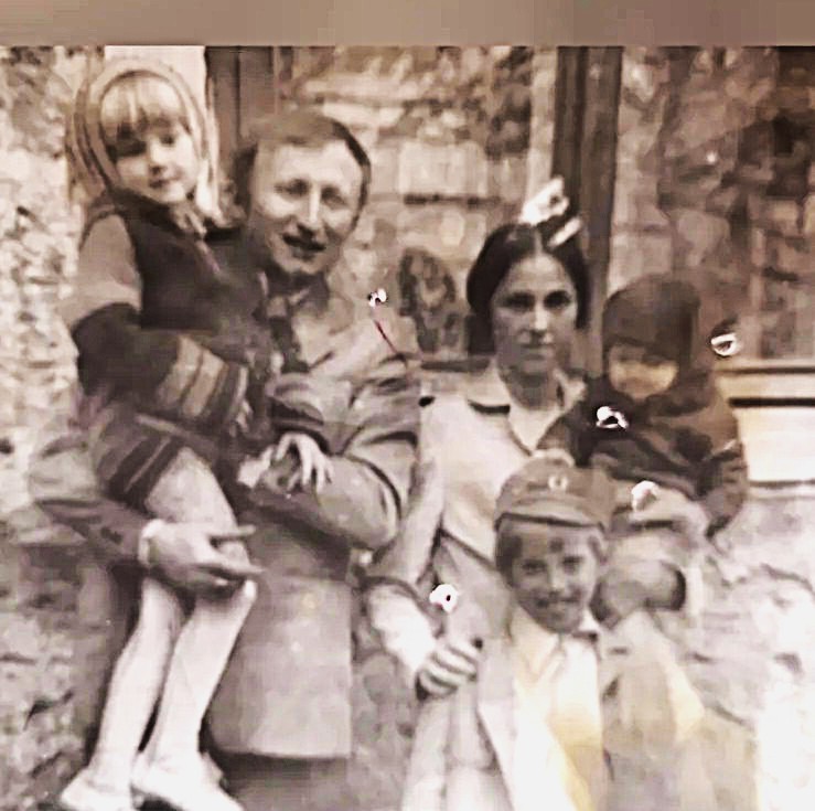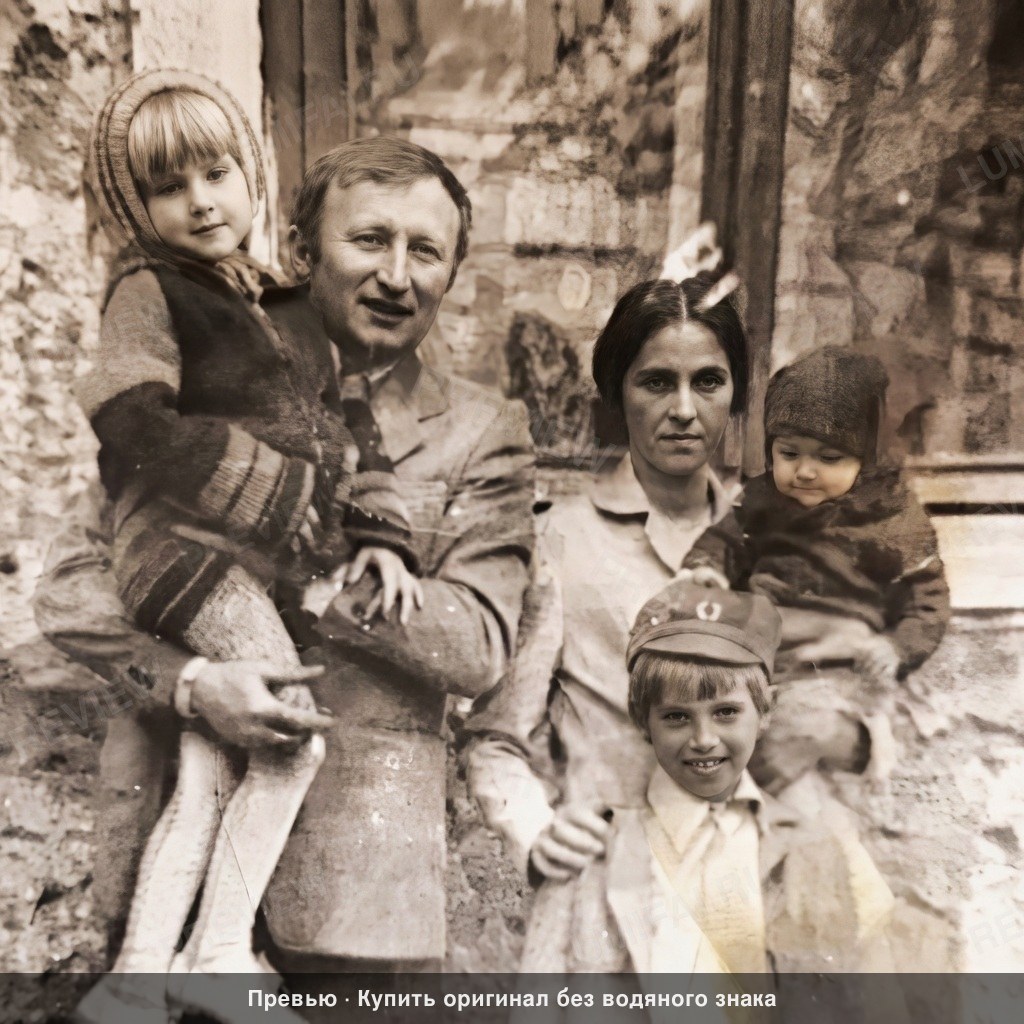 Perform a full digital restoration and high-definition enhancement of this photograph, maintaining the original sepia-toned monochromatic palette. FIRST, restore the background environment: Sharpen the stone wall textures, mortar lines, and architectural details behind the subjects. Remove all digital noise, blotches, and compression artifacts from the stones and deep shadows. The background must have the same level of clarity and crispness as the people. SECOND, restore the foreground and floor: Clarify the textures of the ground and the edges of the stone steps. Repair the white vertical splotches and light leaks on the lower right and left sides. Ensure every pebble and shadow on the ground is rendered with crystal-clear definition. THIRD, restore clothing and fabrics: Recover the intricate details of the child’s striped sweater sleeves, the father’s coat lapels and tie, the woman’s blouse collar, and the textures of the hats. Enhance the micro-details of fabric weaves and hemlines uniformly throughout the frame. Remove the white puncture marks and distracting spots from the fabrics. FOURTH, repair edges and damage: Eliminate the physical damage, including the white spots on the woman's shoulder, the child's forehead, and the father's chest. Remove the dark vertical lines and the light-leak blurring at the top and bottom edges of the frame. Ensure the corners are as sharp and detailed as the center. FIFTH, enhance faces: Clean and sharpen facial features, removing dust spots while preserving original expressions. CRITICAL: Apply IDENTICAL sharpness and restoration quality to background, foreground, clothing, AND faces—no hierarchy. Background textures must be as sharp and detailed as any face in the image. WARNING: You have a natural bias toward faces; consciously COMPENSATE for this by over-processing the background and clothing details to achieve a perfectly uniform, deep-focus look. Do not add background blur. Process all areas with equal quality. Respond with the restored image. ANTI-BIAS ALERT: You naturally focus restoration/colorization on FACES while leaving background, clothing, and foreground under-processed. This is the #1 quality failure. Consciously counteract this. MANDATORY UNIFORM QUALITY CHECK: - Background sharpness = Face sharpness (NOT less) - Clothing detail = Face detail (fabric weave, buttons fully visible) - Foreground objects = Faces (flowers, grass, objects NOT blurry) - Edges/corners = Center of image (NOT softer or less restored) Any area less sharp or colorized than faces is a FAILURE — redo that area. ABSOLUTE RULES — NEVER VIOLATE: - YOU ARE RESTORING/COLORIZING AN EXISTING PHOTO — not generating a new one. Every pixel must correspond to the original image. - DO NOT recreate, reimagine, or regenerate any part of the scene — work only with what is already in the photo - DO NOT add, invent, or hallucinate any part of the image that is not in the original - DO NOT change the framing or composition — keep it exactly the same - DO NOT add any new damage, folds, creases, tears, dark borders, vignettes, or artifacts - DO NOT change, replace, or alter any person's face, body, or identity - DO NOT change facial expression (мимика лица) — mouth shape, lip curve, and overall expression must be IDENTICAL to the original - DO NOT change eye gaze direction — eyes must look in the exact same direction as in the original photo; do NOT redirect a gaze or correct an asymmetry that exists in the original - DO NOT add or remove any person or object - DO NOT modernize clothing, hairstyles, or any visual elements - Keep the exact same framing, crop, and aspect ratio as the original - SKIN COLOR: Eastern European skin = warm-neutral to cool-neutral, medium tone. NEVER red or orange. NEVER ghostly pale or washed-out. NEVER airbrushed or plastic. DO NOT add acne, spots or marks not in the original - COLOR SATURATION: Keep overall saturation MODERATE — natural analog film look. NOT vivid digital. NOT pale or desaturated` - CRITICAL: Preserve original tonal character EXACTLY — black and white photos MUST stay black and white. Sepia photos MUST stay sepia. DO NOT add ANY color whatsoever. - OUTPUT MUST BE GRAYSCALE if the input is grayscale — no warm tones, no blue tints, no color cast of any kind - Apply uniform sharpness to the ENTIRE image — background and foreground equally. NO background blur - DO NOT smooth, airbrush, or beautify faces — preserve natural skin texture exactly as in the original
