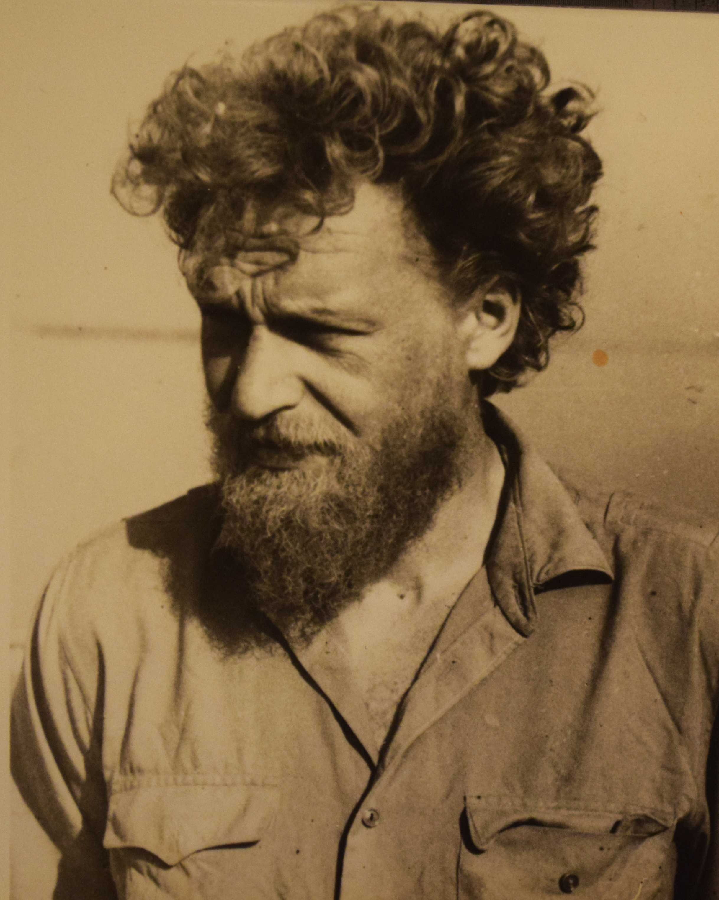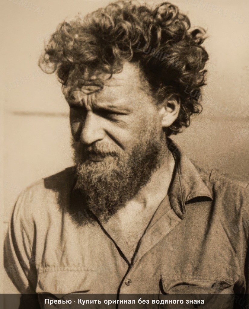 Professionally restore and high-fidelity enhance this mid-20th-century sepia-toned film photograph. **Photo Subject & Setting:** The image features a single man from the mid-1900s, shown from the chest up. He has thick, voluminous, curly hair and a full, dense beard. He is wearing a rugged, collared work shirt or field jacket with visible chest pockets and buttons. He is looking downward and to his right in a three-quarter profile. **Restoration Instructions (Remove Damage):** - Remove the prominent orange/brown circular stain located on the right side of the background. - Clean all dark dust spots, specks, and micro-scratches scattered across the man's shirt and the background wall. - Fix the horizontal scratch/crease line running through the background on the left side. - Repair the black edge artifacts along the top and right margins of the frame. - Smooth out mottled fading and chemical stains on the shirt and the negative space behind the subject. **Global Quality Enhancement & Uniformity (CRITICAL):** - **Non-Selective Sharpness:** Apply a uniform increase in sharpness across the ENTIRE frame. Do not prioritize the face over other areas. Every part of the image must be equally in focus. - **Texture Recovery:** Reconstruct the fine detail of the fabric weave and stitching on the shirt and pockets. Enhance the individual strands and curls of his hair and beard with crisp, defined lines from the roots to the very edges of his silhouette. - **Background Integrity:** Ensure the background wall remains perfectly sharp and textured, including the subtle horizontal architectural lines, without any artificial blurring or depth-of-field effects. - **Tonal Range:** Improve dynamic range by recovering shadow detail in the beard and shirt folds, and highlight detail in the hair and forehead. Enhance contrast while strictly preserving the original warm sepia monochrome palette. - **Film Grain Management:** Reduce distracting digital noise and chemical blotchiness while retaining a fine, uniform, and natural film grain texture across the whole image. The final result must look like a pristine, high-resolution original negative print where the background, clothing, and hair are restored to the same level of extreme clarity as the facial features. ABSOLUTE RULES — NEVER VIOLATE: - DO NOT add, invent, or hallucinate any part of the image that is not in the original - DO NOT change the framing or composition — keep it exactly the same - DO NOT add any new damage, folds, creases, tears, dark borders, vignettes, or artifacts - DO NOT change, replace, or alter any person's face, body, or identity - DO NOT add or remove any person or object - DO NOT modernize clothing, hairstyles, or any visual elements - Keep the exact same framing, crop, and aspect ratio as the original - UNIFORM QUALITY: Process the ENTIRE image with equal attention — foreground flowers/textures, background elements, and edges must have the SAME sharpness and detail as faces. Do NOT leave any area blurry, simplified, or less detailed than another - SKIN COLOR: Eastern European skin = pale/medium, cool-neutral tone. NEVER red, orange, or overly warm. NEVER airbrushed or plastic - COLOR SATURATION: Keep overall saturation LOW TO MODERATE — muted analog film look, NOT vivid digital colors` - Preserve original tonal character: sepia stays sepia, black and white stays black and white - Apply uniform sharpness to the ENTIRE image — background and foreground equally. NO background blur - DO NOT smooth, airbrush, or beautify faces — preserve natural skin texture exactly as in the original