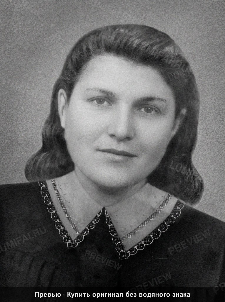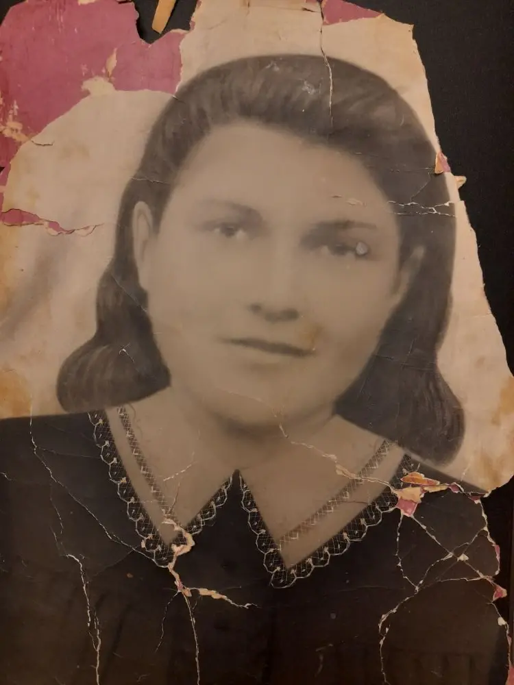 Restore and enhance this vintage black and white photograph by first reconstructing the background and environmental field. Completely repair the large torn-away sections in the upper left and right, replacing missing paper with a clean, uniformly textured studio backdrop. Remove all stains, yellowing, and mold spots from the background, ensuring it is as sharp and grain-balanced as the subject. In the foreground, address the structural integrity of the lower half. Remove the heavy horizontal and vertical cracks, white gouges, and paper losses crossing the subject's torso. Reconstruct all missing dark tones to match the existing lighting. For clothing, restore the dark dress and intricate lace collar with full micro-detail. Sharpen the geometric stitch patterns and lace webbing to be perfectly crisp. Recover shadow detail in the black fabric folds while removing all surface scratches and dust. Carefully repair the edges and corners of the image. The jagged, damaged perimeter must be reconstructed into a clean, rectangular frame with no fading or loss of focus at the margins. Apply identical sharpness and restoration quality to these borders as you do to the center. Finally, restore the face by removing the crack crossing the chin and the white spot on the left eye. Sharpen facial features and hair texture to match the high-resolution quality of the clothing and background. CRITICAL: Apply IDENTICAL sharpness and restoration quality to background, foreground, clothing, AND faces—no hierarchy. Background textures must be as sharp and detailed as any face in the image. Foreground clothing textures (stitch weave, lace) must be restored with FULL micro-detail. Edges and corners of the photo must be processed with the SAME care as the center. Keep everything in sharp focus with NO background blur. WARNING: You have a natural bias toward faces. Consciously COMPENSATE—over-process background and clothing to balance. Preserve the original black and white tonal character without changing temperature. Process all areas with equal quality. Respond by applying extra restoration effort to background and clothing to counteract face-bias. ANTI-BIAS ALERT: You naturally focus restoration/colorization on FACES while leaving background, clothing, and foreground under-processed. This is the #1 quality failure. Consciously counteract this. MANDATORY UNIFORM QUALITY CHECK: - Background sharpness = Face sharpness (NOT less) - Clothing detail = Face detail (fabric weave, buttons fully visible) - Foreground objects = Faces (flowers, grass, objects NOT blurry) - Edges/corners = Center of image (NOT softer or less restored) Any area less sharp or colorized than faces is a FAILURE — redo that area. ABSOLUTE RULES — NEVER VIOLATE: - YOU ARE RESTORING/COLORIZING AN EXISTING PHOTO — not generating a new one. Every pixel must correspond to the original image. - DO NOT recreate, reimagine, or regenerate any part of the scene — work only with what is already in the photo - DO NOT add, invent, or hallucinate any part of the image that is not in the original - DO NOT change the framing or composition — keep it exactly the same - DO NOT add any new damage, folds, creases, tears, dark borders, vignettes, or artifacts - DO NOT change, replace, or alter any person's face, body, or identity - DO NOT add or remove any person or object - DO NOT modernize clothing, hairstyles, or any visual elements - Keep the exact same framing, crop, and aspect ratio as the original - SKIN COLOR: Eastern European skin = warm-neutral to cool-neutral, medium tone. NEVER red or orange. NEVER ghostly pale or washed-out. NEVER airbrushed or plastic. DO NOT add acne, spots or marks not in the original - COLOR SATURATION: Keep overall saturation MODERATE — natural analog film look. NOT vivid digital. NOT pale or desaturated` - Preserve original tonal character: sepia stays sepia, black and white stays black and white - Apply uniform sharpness to the ENTIRE image — background and foreground equally. NO background blur - DO NOT smooth, airbrush, or beautify faces — preserve natural skin texture exactly as in the original