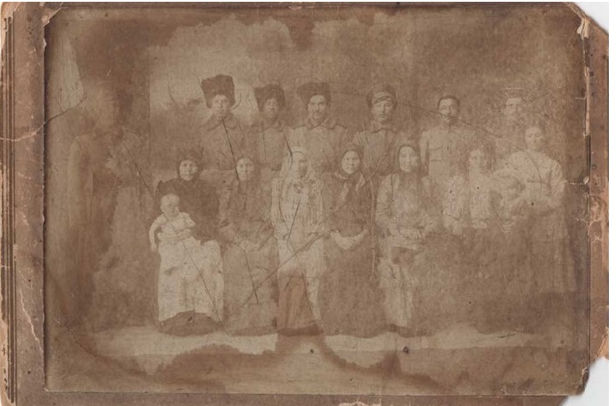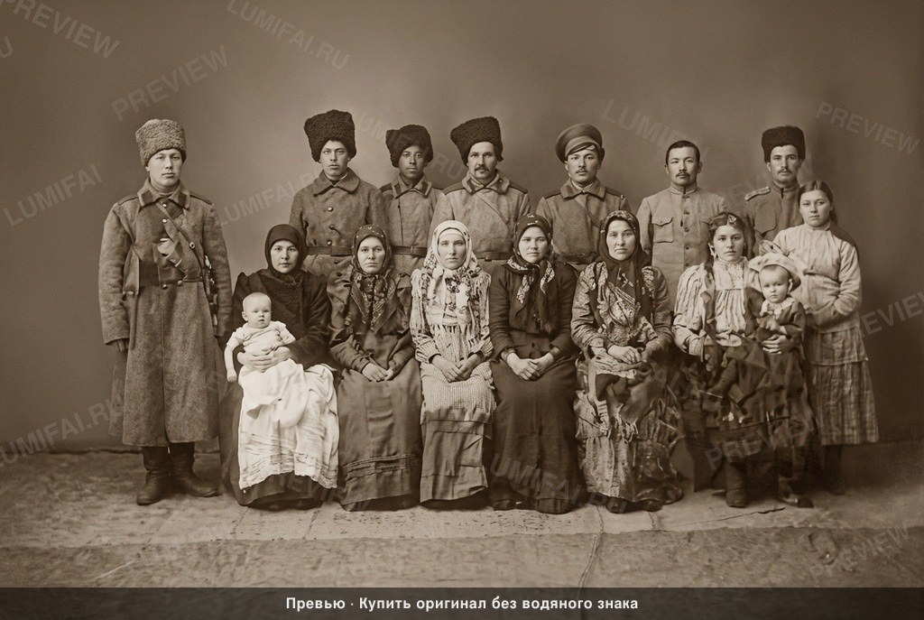 Restore this sepia photograph by first focusing on the neutral studio backdrop. Remove all vertical scratches, large dark water stains at the base, and mold spots. Sharpen the wall texture to match the subjects exactly. Ensure the upper corners and the hazy background areas are rendered with high clarity and uniform tonal range. Second, restore the ground and foreground plane. Eliminate the heavy staining along the bottom edge. Recover the texture of the floor and any foot-level details, ensuring they are as sharp as the people standing on them. Remove all dust spots and paper abrasions. Third, reconstruct the clothing textures. Detail the heavy fabric of the men's tall hats, the intricate patterns of the women's headscarves, and the specific weave of the coats and dresses. Restore buttons, hems, and folds with full micro-detail. The textures of the infant's white gown must be recovered from the faded highlights with crisp edges. Fourth, repair the severe damage at the edges and corners. Rebuild the missing paper sections on the left and right sides. Remove all cracks and creases that bisect the frame, ensuring the repair is seamless and sharp from corner to corner. Fifth, restore the faces of the large group. Clarify features and eyes, maintaining the original sepia tone without introducing modern skin smoothing. CRITICAL: Apply IDENTICAL sharpness and restoration quality to background, foreground, clothing, AND faces—no hierarchy. Background walls and ground must be as sharp as any face. Clothing textures must be restored with FULL micro-detail. WARNING: You have a natural bias toward faces; consciously COMPENSATE by over-processing background and clothing to ensure a flat, uniform focus across the entire image. Preserve the original monchrome sepia palette exactly. ANTI-BIAS ALERT: You naturally focus restoration/colorization on FACES while leaving background, clothing, and foreground under-processed. This is the #1 quality failure. Consciously counteract this. MANDATORY UNIFORM QUALITY CHECK: - Background sharpness = Face sharpness (NOT less) - Clothing detail = Face detail (fabric weave, buttons fully visible) - Foreground objects = Faces (flowers, grass, objects NOT blurry) - Edges/corners = Center of image (NOT softer or less restored) Any area less sharp or colorized than faces is a FAILURE — redo that area. ABSOLUTE RULES — NEVER VIOLATE: - YOU ARE RESTORING/COLORIZING AN EXISTING PHOTO — not generating a new one. Every pixel must correspond to the original image. - DO NOT recreate, reimagine, or regenerate any part of the scene — work only with what is already in the photo - DO NOT add, invent, or hallucinate any part of the image that is not in the original - DO NOT change the framing or composition — keep it exactly the same - DO NOT add any new damage, folds, creases, tears, dark borders, vignettes, or artifacts - DO NOT change, replace, or alter any person's face, body, or identity - DO NOT add or remove any person or object - DO NOT modernize clothing, hairstyles, or any visual elements - Keep the exact same framing, crop, and aspect ratio as the original - SKIN COLOR: Eastern European skin = warm-neutral to cool-neutral, medium tone. NEVER red or orange. NEVER ghostly pale or washed-out. NEVER airbrushed or plastic. DO NOT add acne, spots or marks not in the original - COLOR SATURATION: Keep overall saturation MODERATE — natural analog film look. NOT vivid digital. NOT pale or desaturated` - Preserve original tonal character: sepia stays sepia, black and white stays black and white - Apply uniform sharpness to the ENTIRE image — background and foreground equally. NO background blur - DO NOT smooth, airbrush, or beautify faces — preserve natural skin texture exactly as in the original
