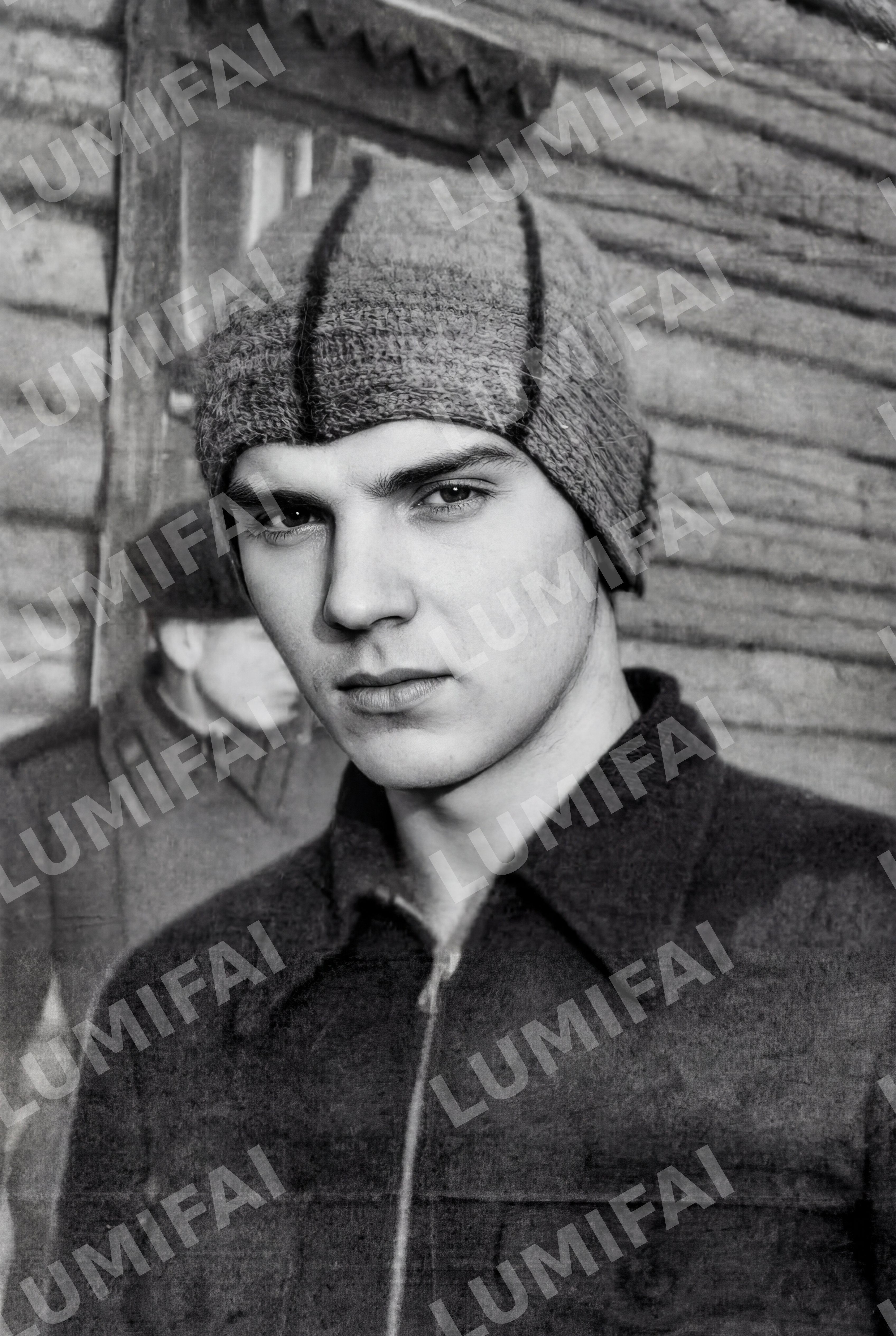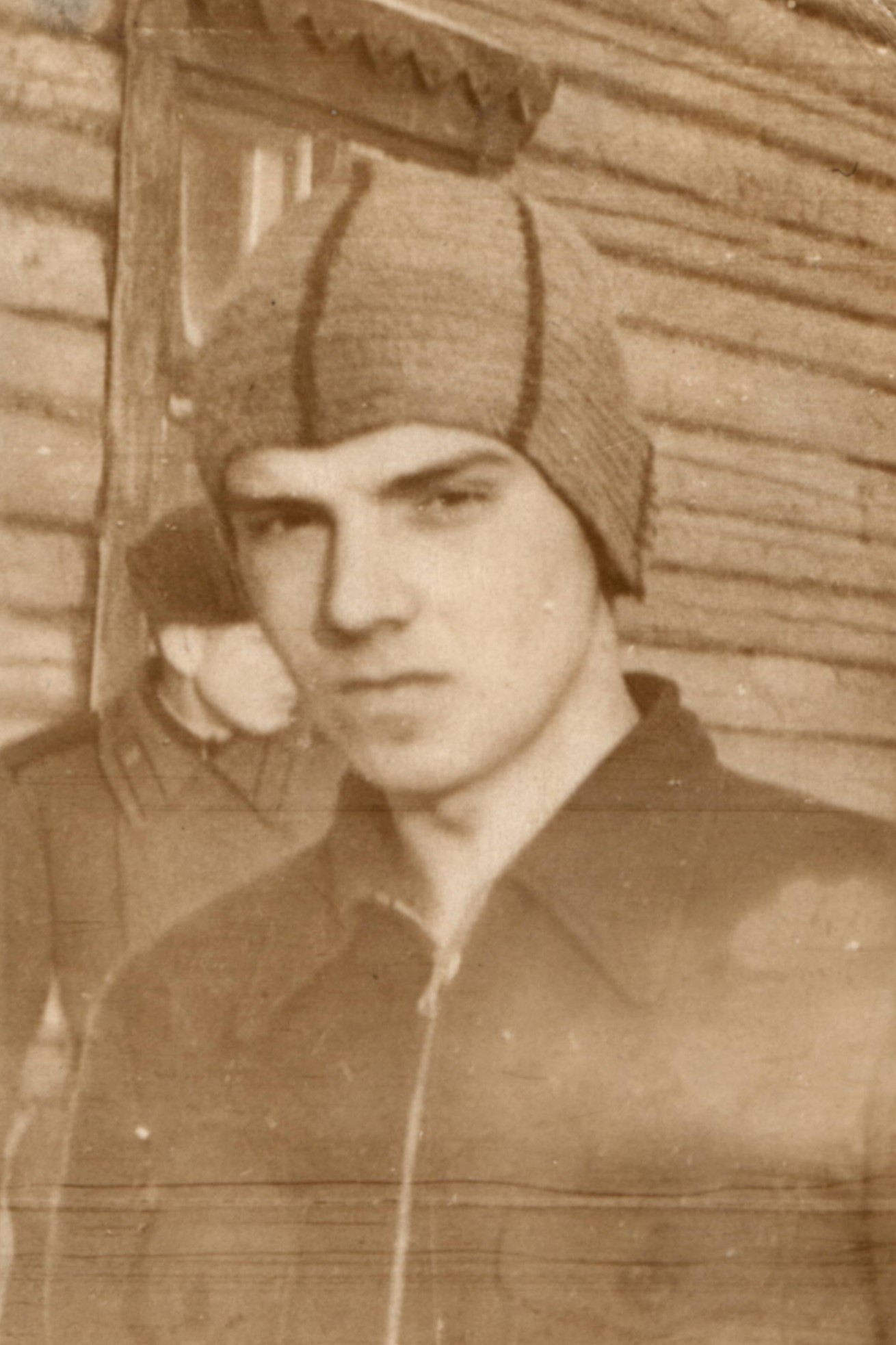 Restore and enhance the photograph with the following instructions: 1. The photo shows two people. The person in the foreground is fully visible, wearing a knitted hat and a jacket, directly facing the camera. The second person is in the background, partially obscured and facing sideways, wearing a uniform with a cap. 2. The setting appears to be mid-20th century, outside a wooden building with visible paneling. 3. Damage observed includes fading across the entire image, multiple scratches, and minor dust spots throughout. There is slight folding damage mostly visible on the lower part and a stain on the right side. 4. Focus on increasing sharpness, particularly on facial features such as eyes and lips, and enhance the texture of the knitted hat and jacket. Improve overall tonal contrast and dynamic range, paying special attention to highlight and shadow recovery. Reduce grain while maintaining the natural texture of the image. Ensure the photo remains black and white.
