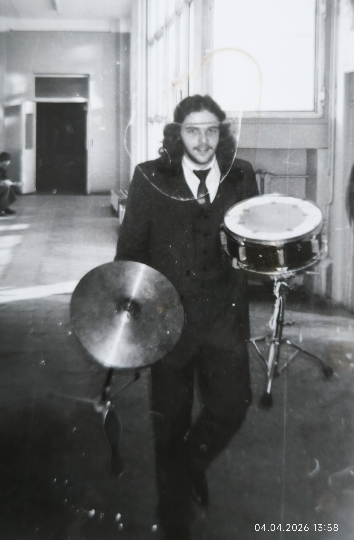 Restore and enhance this black and white photograph by removing all physical artifacts. First, focus on the background hallway and architectural structures: remove the circular white hair / scratch mark spanning the upper-right window and ceiling, erase all white dust flecks and spots from the walls, doorframe, and floor, and sharpen the distant hallway details to match the foreground clarity. Second, restore the foreground musical equipment: sharpen the snare drum's metallic rim, tightening screws, and the texture of the drum head; clarify the circular lathe marks on the cymbal and ensure the tripod legs are crisp and free of motion blur or film grain. Third, restore the clothing: recover the distinct fabric weave and tonal depth of the dark three-piece suit, waistcoat, and tie, ensuring every button and seam is rendered with high-frequency detail. Fourth, repair all edges and corners: remove the white speckling throughout the bottom edge and the digital timestamp in the lower right, ensuring the floor texture is uniform to the corners without vignette or blurring. Last, clarify the person's face and hair, maintaining original features without over-smoothing. Apply IDENTICAL sharpness and restoration quality to background, foreground, clothing, AND faces—no hierarchy. Background walls and windows must be as sharp and detailed as any face in the image. Foreground drums and cymbals must be restored to the SAME quality level as faces. Clothing textures (fabric weave, lapels) must be restored with FULL micro-detail. Edges and corners of the photo must be processed with the SAME care as the center. DO NOT add background blur or depth-of-field; everything must be in sharp focus. WARNING: You have a natural bias toward faces. Consciously COMPENSATE by over-processing the background, floor, and clothing to balance the final image. CRITICAL: Process all areas with equal quality. Compensate for natural face-bias by applying extra restoration effort to background, clothing, and foreground objects. ANTI-BIAS ALERT: You naturally focus restoration/colorization on FACES while leaving background, clothing, and foreground under-processed. This is the #1 quality failure. Consciously counteract this. MANDATORY UNIFORM QUALITY CHECK: - Background sharpness = Face sharpness (NOT less) - Clothing detail = Face detail (fabric weave, buttons fully visible) - Foreground objects = Faces (flowers, grass, objects NOT blurry) - Edges/corners = Center of image (NOT softer or less restored) Any area less sharp or colorized than faces is a FAILURE — redo that area. ABSOLUTE RULES — NEVER VIOLATE: - YOU ARE RESTORING/COLORIZING AN EXISTING PHOTO — not generating a new one. Every pixel must correspond to the original image. - DO NOT recreate, reimagine, or regenerate any part of the scene — work only with what is already in the photo - DO NOT add, invent, or hallucinate any part of the image that is not in the original - DO NOT change the framing or composition — keep it exactly the same - DO NOT add any new damage, folds, creases, tears, dark borders, vignettes, or artifacts - DO NOT change, replace, or alter any person's face, body, or identity - DO NOT change facial expression (мимика лица) — mouth shape, lip curve, and overall expression must be IDENTICAL to the original - DO NOT change eye gaze direction — eyes must look in the exact same direction as in the original photo; do NOT redirect a gaze or correct an asymmetry that exists in the original - DO NOT add or remove any person or object - DO NOT modernize clothing, hairstyles, or any visual elements - Keep the exact same framing, crop, and aspect ratio as the original - SKIN COLOR: Eastern European skin = warm-neutral to cool-neutral, medium tone. NEVER red or orange. NEVER ghostly pale or washed-out. NEVER airbrushed or plastic. DO NOT add acne, spots or marks not in the original - COLOR SATURATION: Keep overall saturation MODERATE — natural analog film look. NOT vivid digital. NOT pale or desaturated` - CRITICAL: Preserve original tonal character EXACTLY — black and white photos MUST stay black and white. Sepia photos MUST stay sepia. DO NOT add ANY color whatsoever. - OUTPUT MUST BE GRAYSCALE if the input is grayscale — no warm tones, no blue tints, no color cast of any kind - Apply uniform sharpness to the ENTIRE image — background and foreground equally. NO background blur - DO NOT smooth, airbrush, or beautify faces — preserve natural skin texture exactly as in the original