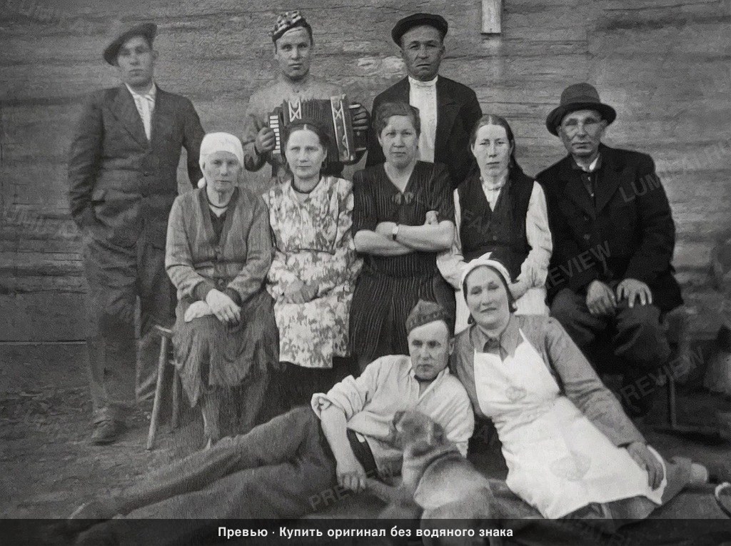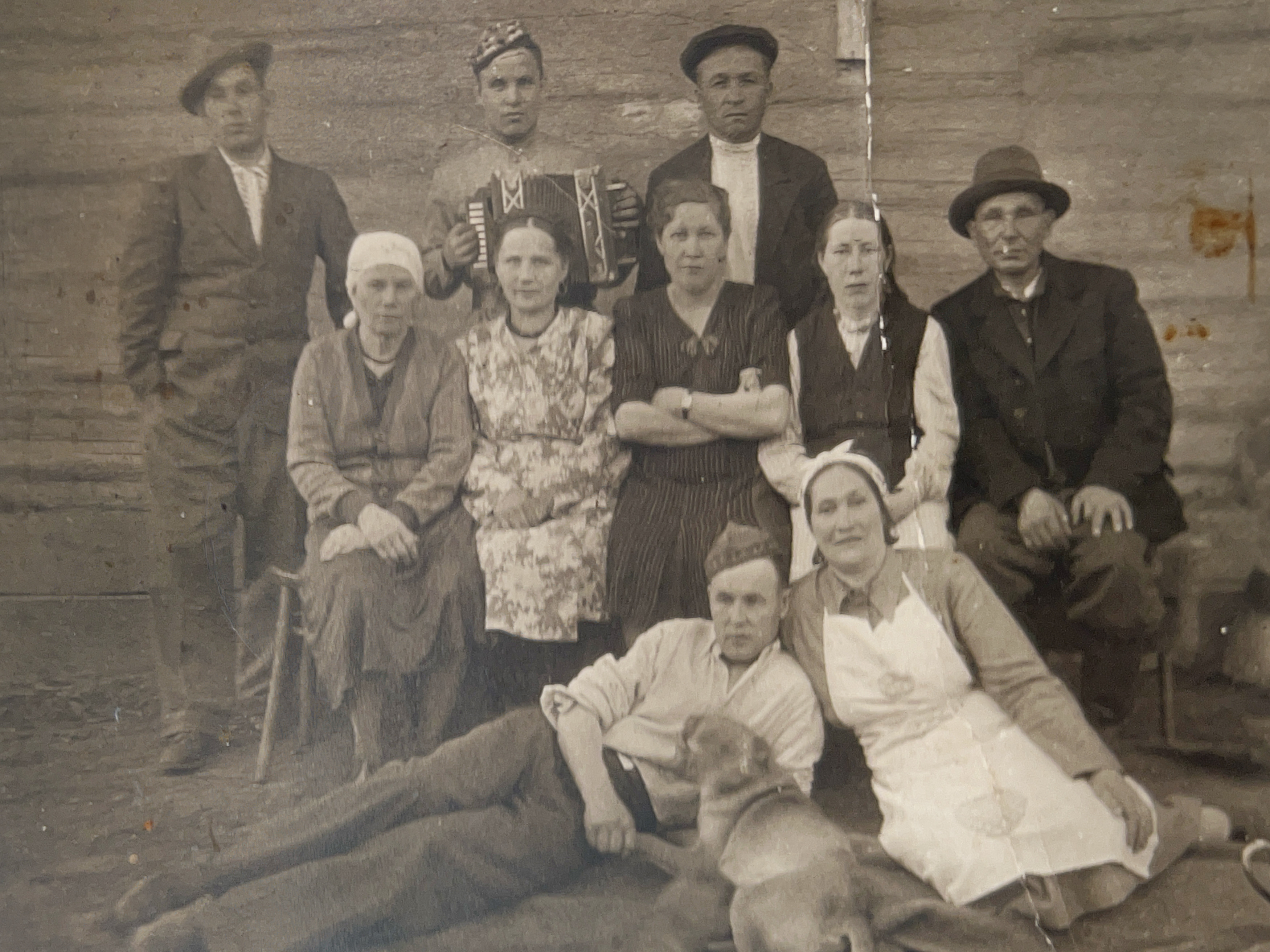 Restore and enhance this photograph to its maximum possible technical quality — uniformly across every pixel. Background, clothing, sky, ground, objects must be as sharp and detailed as any face. Apply IDENTICAL enhancement quality everywhere — no hierarchy. Sharpen, denoise, and recover full micro-detail in the horizontal wooden log cabin wall in the background. Every wood grain, crack, and texture of the timber must be as crisp as any face. Denoise the ground and blanket in the foreground, recovering sharp textures of the soil and fabric fibers. This area must be perfectly clear and high-resolution. Sharpen and define the musical accordion, ensuring the keys and bellows are distinct and reflective. Recover the texture of the dog's fur in the foreground, making every strand visible. Sharpen the wooden stools and benches to show clear edge definition. Recover the fabric weave, patterns, and folds for all clothing: the woman's floral dress pattern, the pinstripes on the central woman's dress, the knit texture of the cardigans, the crisp edges of the white aprons and headscarves, and the heavy wool texture of the men's suits and hats. Every button and seam must be rendered with modern optical clarity. Repair and sharpen all edges and corners of the frame. Remove the prominent vertical white crack/tear running through the right side of the image, the large brown chemical stain on the far right edge, the white spots and flecks scattered across the center, and the various scratches and fading throughout the sky-like upper area and the ground. For faces: apply the same sharpening and denoising as everywhere else. Do NOT alter facial structure, expression, identity, or proportions. Remove any damage on the face by inpainting from context only. Preserve skin texture — pores, fine lines, natural imperfections. Same quality, no special treatment. Preserve the original sepia tonal character; do not add color. Output must have the EXACT same aspect ratio as the input. Do not expand the canvas. Do not fill in areas outside the original photo. Every area must be equally sharp and clean. Blurry background or unsharp clothing = critical failure. No area is more important than any other. ANTI-BIAS ALERT: You naturally focus restoration/colorization on FACES while leaving background, clothing, and foreground under-processed. This is the #1 quality failure. Consciously counteract this. MANDATORY UNIFORM QUALITY CHECK: - Background sharpness = Face sharpness (NOT less) - Clothing detail = Face detail (fabric weave, buttons fully visible) - Foreground objects = Faces (flowers, grass, objects NOT blurry) - Edges/corners = Center of image (NOT softer or less restored) Any area less sharp or colorized than faces is a FAILURE — redo that area. ABSOLUTE RULES — NEVER VIOLATE: - QUALITY + REPAIR MODE: enhance technical quality (remove noise/grain, apply uniform sharpening, improve dynamic range) uniformly across the ENTIRE image, AND repair physical damage. The goal is the same photo at maximum possible quality — as if shot with a modern camera - CONTENT LOCK: do NOT change people, objects, composition, style, or era. Same scene, same identity — just technically better. Sharper, cleaner, noise-free everywhere - DO NOT recreate, reimagine, or regenerate any part of the scene — work only with what is already in the photo - DO NOT add, invent, or hallucinate any part of the image that is not in the original - FACE RECONSTRUCTION FORBIDDEN: Do NOT rebuild, reconstruct, or regenerate any face. Ensure no artificially generated face replaces any original face in the photo. Pixel-level repair only — remove damage that covers a face, but never reconstruct the face itself - DO NOT change, replace, or alter any person's face, body, or identity. 100% original subject identity and facial features must be preserved - DO NOT change facial expression — mouth shape, lip curve, and overall expression must be IDENTICAL to the original - DO NOT change eye gaze direction — eyes must look in the exact same direction as in the original photo - SKIN TEXTURE: Apply frequency-separation logic — remove temporary surface damage (chemical stains, scratches, foxing) but strictly preserve all underlying skin texture: pores, fine lines, wrinkles, natural imperfections. Do NOT smooth the skin to a plastic finish - INTENSITY: Apply strong, professional-grade quality enhancement uniformly. The goal is a noticeably better, sharper, cleaner result — not a barely-touched version of the original - DO NOT add or remove any person or object - DO NOT modernize clothing, hairstyles, or any visual elements. Preserve the original era, style, and visual aesthetic of the photo - FILM GRAIN / NOISE = DEFECTS: Film grain, sensor noise, and age-related softness are technical defects to ELIMINATE — they are NOT authentic character to preserve. Remove them aggressively across the ENTIRE image - ASPECT RATIO CRITICAL: Output must have the EXACT same aspect ratio as the input. DO NOT crop, add borders, expand canvas, or shift composition. Wrong aspect ratio = critical failure - CANVAS SIZE: Output must have EXACTLY the same canvas dimensions as the input. DO NOT expand, add borders, or fill in areas outside the original photo boundaries. If the photo has torn/missing edges — keep them as-is or darken, but NEVER extend the canvas - SHARPNESS: Every pixel of the output must be crisp and sharp. NO softness, NO blur, NO smoothing anywhere. Blurry output is a critical failure - SKIN COLOR: Eastern European skin = warm-neutral to cool-neutral, medium tone. NEVER red or orange. NEVER ghostly pale or washed-out. NEVER airbrushed or plastic. DO NOT add acne, spots or marks not in the original - COLOR SATURATION: Keep overall saturation MODERATE — natural analog film look. NOT vivid digital. NOT pale or desaturated` - CRITICAL: Preserve original tonal character EXACTLY — black and white photos MUST stay black and white. Sepia photos MUST stay 