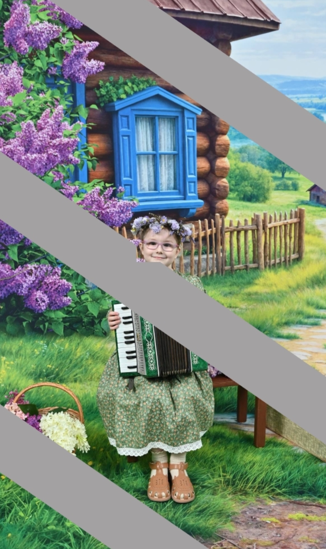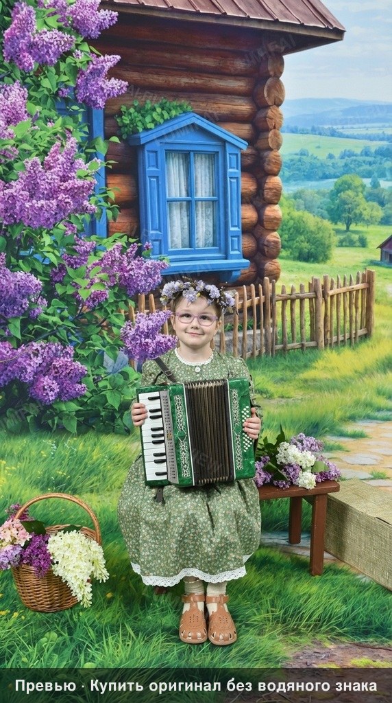 Restore this photograph by removing the heavy gray diagonal occlusions and digital artifacts, reconstructing all missing data. First, meticulously rebuild the background environment: the log cabin walls, the blue-painted window frame and glass, the distant green hills, and the individual leaves and purple blossoms of the lilac bushes. Ensure the rustic wooden fence and the distant sky are rendered with high-definition clarity. Second, restore the foreground grass, the wicker basket of flowers, and the accordion held by the child; every piano key and bellows fold must be distinct and sharp. Third, reconstruct the clothing textures, specifically the fine floral pattern of the green dress and the white lace trim at the hem, restoring the micro-detail of the fabric weave. Fourth, clean all edges and corners of the image to ensure consistent sharpness from the center to the very frame. Last, restore the child’s face, glasses, and floral crown. Apply IDENTICAL sharpness and restoration quality to background, foreground, clothing, AND faces—no hierarchy. Background trees, walls, and sky must be as sharp and detailed as any face in the image. Foreground objects must be restored to the SAME quality level as faces. Clothing textures (fabric weave, buttons, laces) must be restored with FULL micro-detail. CRITICAL: Process all areas with equal quality. Compensate for natural face-bias by applying extra restoration effort to the background, clothing, and foreground objects. Everything must be in deep focus with no background blur or depth-of-field. Preserve original color and tonal character exactly. ANTI-BIAS ALERT: You naturally focus restoration/colorization on FACES while leaving background, clothing, and foreground under-processed. This is the #1 quality failure. Consciously counteract this. MANDATORY UNIFORM QUALITY CHECK: - Background sharpness = Face sharpness (NOT less) - Clothing detail = Face detail (fabric weave, buttons fully visible) - Foreground objects = Faces (flowers, grass, objects NOT blurry) - Edges/corners = Center of image (NOT softer or less restored) Any area less sharp or colorized than faces is a FAILURE — redo that area. ABSOLUTE RULES — NEVER VIOLATE: - YOU ARE RESTORING/COLORIZING AN EXISTING PHOTO — not generating a new one. Every pixel must correspond to the original image. - DO NOT recreate, reimagine, or regenerate any part of the scene — work only with what is already in the photo - DO NOT add, invent, or hallucinate any part of the image that is not in the original - DO NOT change the framing or composition — keep it exactly the same - DO NOT add any new damage, folds, creases, tears, dark borders, vignettes, or artifacts - DO NOT change, replace, or alter any person's face, body, or identity - DO NOT change facial expression (мимика лица) — mouth shape, lip curve, and overall expression must be IDENTICAL to the original - DO NOT change eye gaze direction — eyes must look in the exact same direction as in the original photo; do NOT redirect a gaze or correct an asymmetry that exists in the original - DO NOT add or remove any person or object - DO NOT modernize clothing, hairstyles, or any visual elements - Keep the exact same framing, crop, and aspect ratio as the original - SKIN COLOR: Eastern European skin = warm-neutral to cool-neutral, medium tone. NEVER red or orange. NEVER ghostly pale or washed-out. NEVER airbrushed or plastic. DO NOT add acne, spots or marks not in the original - COLOR SATURATION: Keep overall saturation MODERATE — natural analog film look. NOT vivid digital. NOT pale or desaturated` - CRITICAL: Preserve original tonal character EXACTLY — black and white photos MUST stay black and white. Sepia photos MUST stay sepia. DO NOT add ANY color whatsoever. - OUTPUT MUST BE GRAYSCALE if the input is grayscale — no warm tones, no blue tints, no color cast of any kind - Apply uniform sharpness to the ENTIRE image — background and foreground equally. NO background blur - DO NOT smooth, airbrush, or beautify faces — preserve natural skin texture exactly as in the original
