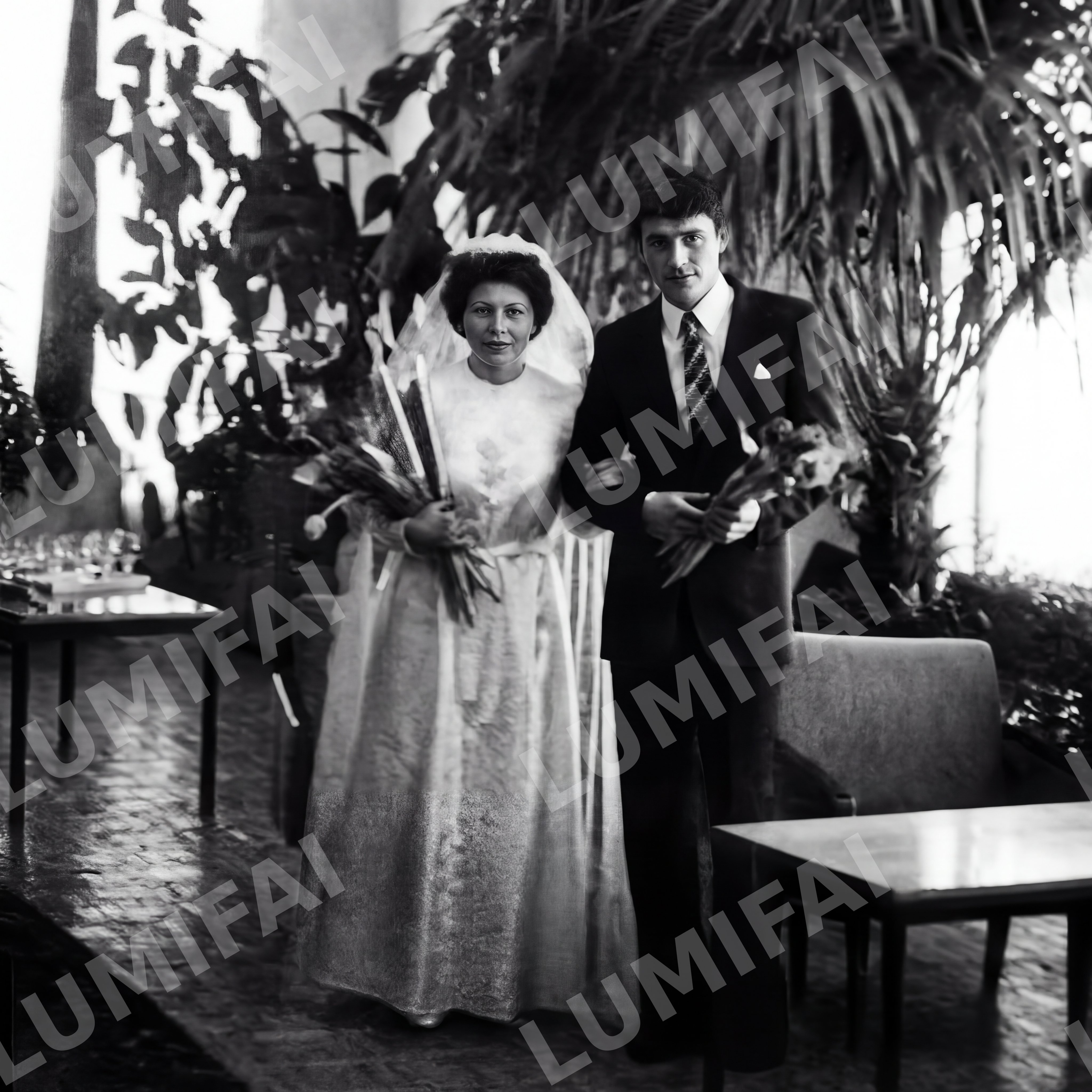 Restore and enhance the following photograph: 1. **Remove all physical damage**: Eliminate scratches, tears, folds, stains, fading, mold, and dust spots. Pay particular attention to the areas surrounding the figures and the background, as there are noticeable imperfections. 2. **Enhance quality**: Sharpen and improve the entire image uniformly. Ensure that every element, including the couple in the foreground, the plants, and the furniture, is equally sharp without introducing any background blur or depth-of-field effect. 3. **Improve tonal contrast**: Enhance the dynamic range across the entire frame while preserving the original tonal character. The image is in black and white, so ensure that the blacks remain true black and highlights are crisp. 4. **Reduce film grain**: Minimize film grain while retaining the natural texture associated with the original film. 5. **Recover lost details**: Focus on recovering shadow and highlight details that may have been obscured. **Description of the photo**: There are two people in the photo— a woman on the left wearing a white wedding dress and holding flowers, and a man on the right dressed in a dark suit with a tie. They are positioned side by side, suggesting a formal setting, likely from the mid-20th century based on their attire. The setting includes visible indoor plants and furniture, indicating an elegantly decorated space. **Specific damage noted**: The image shows scratches on the surface, likely from age, with some mild fading particularly evident in the clothing details. There are also slight dust spots scattered throughout the photo. **Quality enhancements needed**: The most critical enhancements are uniform sharpness across all elements, restoration of lost details in shadows and highlights, and maintaining the integrity of the original black and white tonal character. ABSOLUTE RULES — NEVER VIOLATE: - DO NOT add, invent, or hallucinate any part of the image that is not in the original - DO NOT change the framing or composition — keep it exactly the same - DO NOT add any new damage, folds, creases, tears, dark borders, vignettes, or artifacts - DO NOT change, replace, or alter any person's face, body, or identity - DO NOT add or remove any person or object - DO NOT modernize clothing, hairstyles, or any visual elements - Keep the exact same framing, crop, and aspect ratio as the original - Preserve original tonal character: sepia stays sepia, black and white stays black and white - Apply uniform sharpness to the ENTIRE image — background and foreground equally. NO background blur