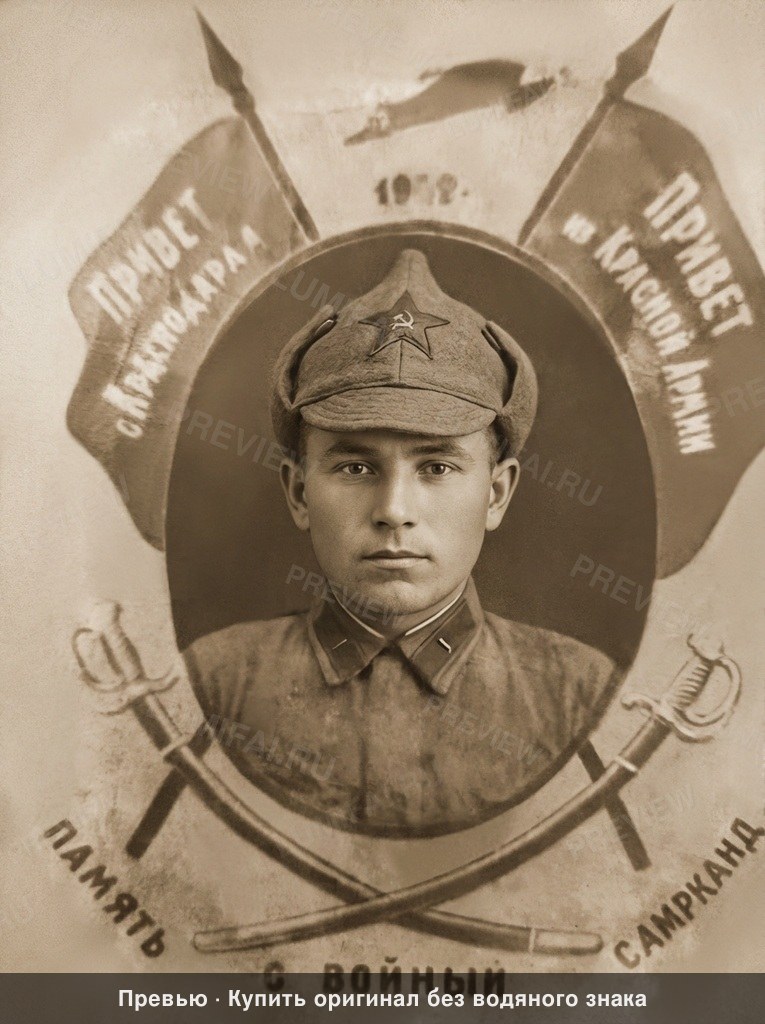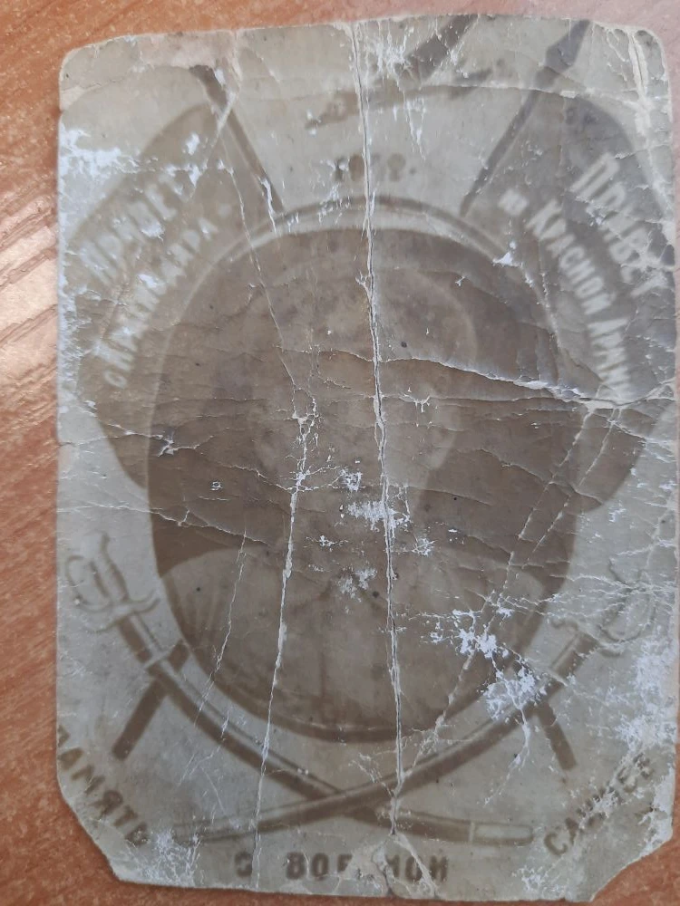 Professionally restore and high-fidelity enhance this historical sepia photograph of a single Soviet Red Army soldier from the early 20th century. **RESTORATION TASKS:** Remove all physical damage across the entire frame. This includes the prominent vertical and horizontal crease lines, deep white cracks and paper losses (especially the large vertical tear through the center), the flaking/chipping at the top and left edges, and the heavy surface mold spots and white abrasions scattered throughout. Reconstruct the lost segments of the decorative frame, the crossed sabers at the bottom, and the two fluttering flags at the top. Precisely restore the Cyrillic text elements: "Привет из Красной Армии" (Greetings from the Red Army) on the right banner, "Привет из Самарканда" (Greetings from Samarkand) on the left, and the inscriptions at the bottom. **UNIFORM QUALITY & ENHANCEMENT:** Apply a uniform, high-definition sharpness to every millimeter of the image. The central portrait of the soldier—showing his facial features, military cap (Budenovka style), and uniform—must be sharp, but the surrounding graphic elements must be equally crisp. Background flags, the texture of the banners, the ornate hilts of the crossed sabers, and the surrounding text must receive the same level of micro-detail and resolution as the face. There is to be NO depth-of-field or background blurring; the entire graphic composition must be in flat, sharp focus from edge to edge and corner to corner. **TONAL FIDELITY:** Maintain the authentic, warm monochromatic sepia-toned character of the original photograph. Do not convert to grayscale or add artificial color. Recover lost shadow detail in the soldier's silhouette and improve micro-contrast to make the faded details pop against the background. Eliminate film grain while preserving the original paper texture. The final result should look like a pristine, unblemished archival print of the original 1920s-era military keepsake. ABSOLUTE RULES — NEVER VIOLATE: - DO NOT add, invent, or hallucinate any part of the image that is not in the original - DO NOT change the framing or composition — keep it exactly the same - DO NOT add any new damage, folds, creases, tears, dark borders, vignettes, or artifacts - DO NOT change, replace, or alter any person's face, body, or identity - DO NOT add or remove any person or object - DO NOT modernize clothing, hairstyles, or any visual elements - Keep the exact same framing, crop, and aspect ratio as the original - UNIFORM QUALITY: Process the ENTIRE image with equal attention — foreground flowers/textures, background elements, and edges must have the SAME sharpness and detail as faces. Do NOT leave any area blurry, simplified, or less detailed than another - SKIN COLOR: Eastern European skin = pale/medium, cool-neutral tone. NEVER red, orange, or overly warm. NEVER airbrushed or plastic - COLOR SATURATION: Keep overall saturation LOW TO MODERATE — muted analog film look, NOT vivid digital colors` - Preserve original tonal character: sepia stays sepia, black and white stays black and white - Apply uniform sharpness to the ENTIRE image — background and foreground equally. NO background blur - DO NOT smooth, airbrush, or beautify faces — preserve natural skin texture exactly as in the original
