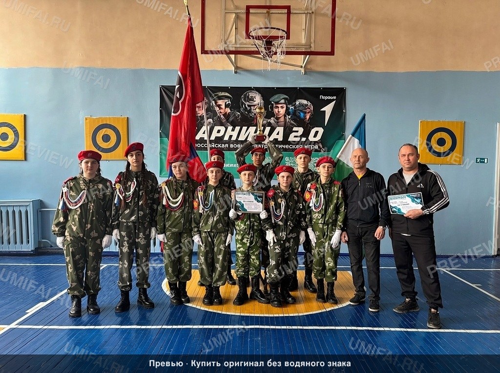 Apply uniform technical enhancement to this scanned image — treat every pixel region identically regardless of content. DO NOT use face detection, face restoration, or face-specific enhancement algorithms. Faces are NOT special regions — treat them exactly like walls, sky, furniture, or any background element. The enhancement quality must be identical across faces, background, clothing, and all other areas. Sharpen, denoise, and recover full detail in the gymnasium background. This includes the blue and beige wall paint, the radiator on the left, the basketball hoop, net, and backboard, the yellow targets, and the large "ZARNITSA 2.0" banner. These areas must be as crisp and clear as any face. Sharpen the floor markings and the individual wooden slats of the blue gymnasium floor, ensuring every line is rendered with high-frequency detail. Sharpen and denoise the red flag, the white flag, the trophy held by the student, and the printed diplomas. Ensure the text on the diplomas and the banner is legible and sharp. Enhance the clothing for every person: sharpen the camouflage patterns of the military uniforms, the texture of the red berets, the white gloves, the braiding, and the fabric of the black tracksuits worn by the men on the right. Recover micro-detail in zippers, buttons, and the three-stripe design on the track jacket. Repair and sharpen all edges and corners of the image, ensuring no fading or softness at the periphery. Ensure the aspect ratio is exactly 4:3 as the original. Output must have the EXACT same aspect ratio as the input. Do not expand, crop, or add borders. Do not expand the canvas. Do not fill in areas outside the original photo. Remove any digital noise, Compression artifacts, and fine dust or scratches present across the gymnasium walls and the characters. Maintain the original color balance and saturation without adding new colors. For faces: apply the EXACT SAME sharpening and denoising as the background and clothing — no more. DO NOT use face restoration, face upscaling, or face enhancement. Faces are just another region of the image — treat them as you would a textured wall. Do NOT alter facial structure, expression, identity, or proportions. Remove any damage by inpainting from context only. Preserve skin texture — pores, fine lines, natural imperfections. Every area must be equally sharp and clean. Blurry background or unsharp clothing = critical failure. No area is more important than any other. ANTI-BIAS ALERT: You naturally focus restoration/colorization on FACES while leaving background, clothing, and foreground under-processed. This is the #1 quality failure. Consciously counteract this. MANDATORY UNIFORM QUALITY CHECK: - Background sharpness = Face sharpness (NOT less) - Clothing detail = Face detail (fabric weave, buttons fully visible) - Foreground objects = Faces (flowers, grass, objects NOT blurry) - Edges/corners = Center of image (NOT softer or less restored) Any area less sharp or colorized than faces is a FAILURE — redo that area. ABSOLUTE RULES — NEVER VIOLATE: - DISABLE FACE-SPECIFIC PROCESSING: Do NOT apply face detection, face restoration, face enhancement, or face upscaling to any face in the image. Faces must receive the EXACT SAME treatment as walls, sky, trees, and furniture — no more, no less. Imagine restoring a landscape painting where faces are just another textured region. - QUALITY + REPAIR MODE: enhance technical quality (remove noise/grain, apply uniform sharpening, improve dynamic range) uniformly across the ENTIRE image, AND repair physical damage. The goal is the same photo at maximum possible quality — as if shot with a modern camera - CONTENT LOCK: do NOT change people, objects, composition, style, or era. Same scene, same identity — just technically better. Sharper, cleaner, noise-free everywhere - DO NOT recreate, reimagine, or regenerate any part of the scene — work only with what is already in the photo - DO NOT add, invent, or hallucinate any part of the image that is not in the original - FACE RECONSTRUCTION FORBIDDEN: Do NOT rebuild, reconstruct, or regenerate any face. Ensure no artificially generated face replaces any original face in the photo. Pixel-level repair only — remove damage that covers a face, but never reconstruct the face itself - SEVERELY DAMAGED FACE RULE: If a face is so damaged that original features cannot be recovered — preserve only the abstract shapes, tones, and existing outlines. DO NOT generate, imagine, or invent what the face might look like. It is better to show a blurry or partially damaged face than to show a different person's face. - WRONG IDENTITY = CRITICAL FAILURE: If the output shows a different person than the input, or a face that was generated/invented by AI, the result is completely unacceptable. A partially damaged original face is always better than a perfect AI-generated replacement face. - DO NOT change, replace, or alter any person's face, body, or identity. 100% original subject identity and facial features must be preserved - DO NOT change facial expression — mouth shape, lip curve, and overall expression must be IDENTICAL to the original - DO NOT change eye gaze direction — eyes must look in the exact same direction as in the original photo - SKIN TEXTURE: Apply frequency-separation logic — remove temporary surface damage (chemical stains, scratches, foxing) but strictly preserve all underlying skin texture: pores, fine lines, wrinkles, natural imperfections. Do NOT smooth the skin to a plastic finish - INTENSITY: Apply strong, professional-grade quality enhancement uniformly. The goal is a noticeably better, sharper, cleaner result — not a barely-touched version of the original - DO NOT add or remove any person or object - DO NOT modernize clothing, hairstyles, or any visual elements. Preserve the original era, style, and visual aesthetic of the photo - FILM GRAIN / NOISE = DEFECTS: Film grain, sensor noise, and age-related softness ar