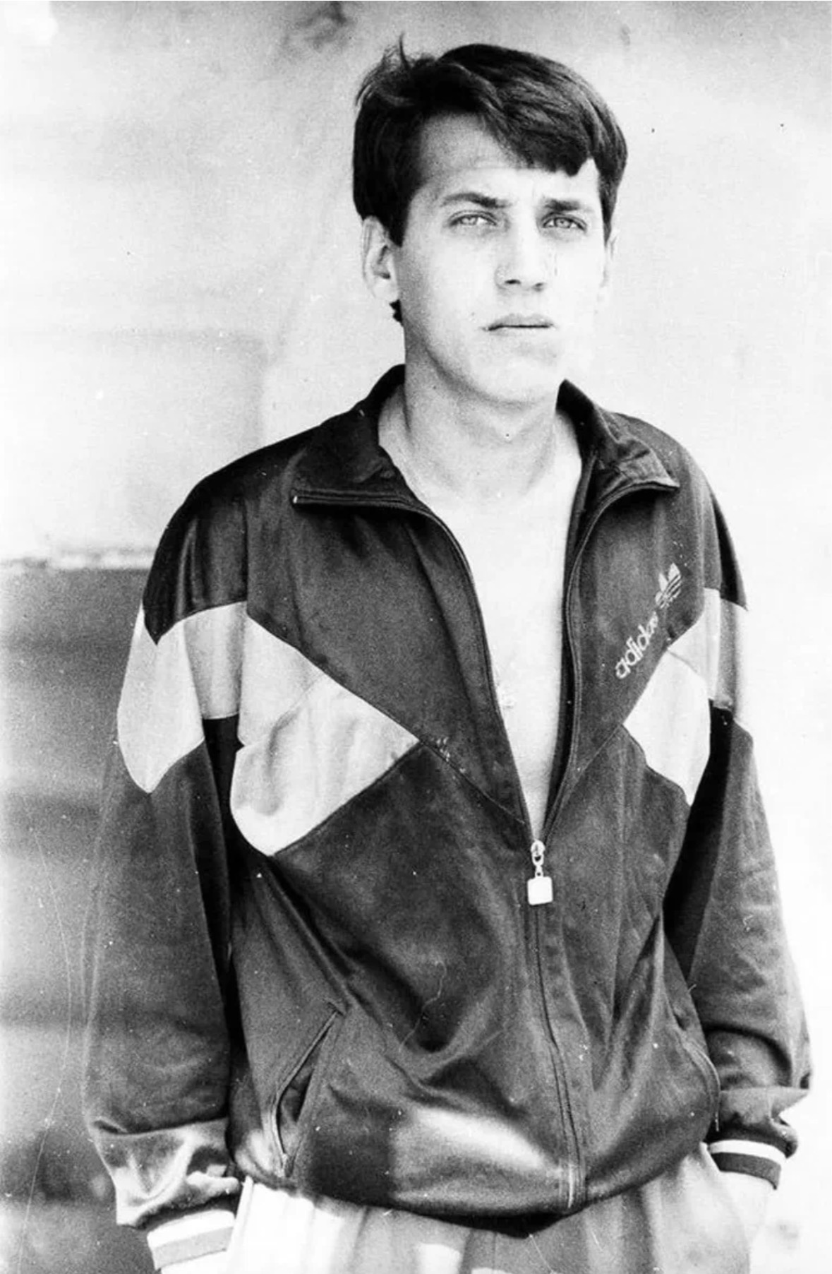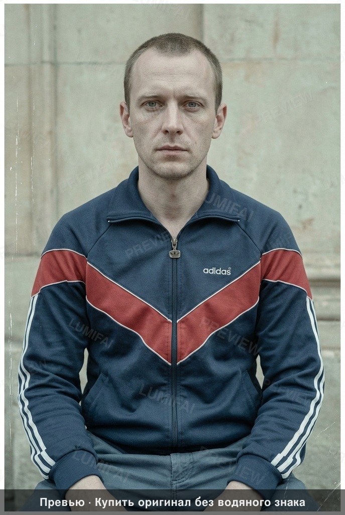 Simulate ORWO Color NC film stock from the late 1980s Soviet era. The palette must feature muted cyan-green midtones, brownish-warm highlights, and very low overall saturation. Skin must be naturally PALE with cool-neutral undertones, avoiding any orange or terracotta warmth. 1. DAMAGE MAP: Focus restoration on the heavy chemical spotting, white dust flecks, and vertical scratches concentrated on the left side (background and sleeve) and the lower right corner. Eliminate the hazy "fogged" appearance on the left edge. 2. BACKGROUND: Restore the wall and architectural elements behind the man with high-fidelity detail. Colorize the wall in a muted, desaturated light grey or pale beige. Ensure the stone/plaster texture is sharp and grain is reduced while maintaining a realistic matte finish. Background must be as sharp and detailed as the subject. 3. FOREGROUND: Restore and colorize the lower portion of the frame where the hands enter pockets. Sharpness must be maintained here to match the face; do not allow the bottom of the image to blur. 4. CLOTHING: Focus 40% of retouching effort on the Adidas track jacket. Restore the fabric weave texture, especially on the cuffs and collar. Colorize the main body of the jacket in a muted navy blue, with the chevron panels in a desaturated red or white, and the Adidas logo and zipper pull in realistic metallic and embroidery shades. The trousers should be a muted, neutral grey or blue. Preserve every stitch, wrinkle, and fray in the fabric. 5. EDGES AND CORNERS: Apply the same level of micro-detail restoration to the extreme corners as the center. Remove chemical stains and light leaks from the perimeter to create a clean, professional analog frame. 6. FACE: Maintain the natural Eastern European pale complexion. Preserve all real human skin texture—pores, fine lines around the eyes, and subtle stubble—without any softening or airbrushing. Eyes should remain light and cool-toned with natural iris detail, not artificially brightened. 7. FINAL REQUIREMENTS: Apply IDENTICAL restoration and colorization quality to background, clothing, and face. Muted analog-film palette—slightly desaturated, cool-neutral overall. WARNING: You have a natural bias toward faces. COMPENSATE—apply extra restoration and colorization effort to background and clothing to ensure uniform high-resolution quality across the entire image. ANTI-BIAS ALERT: You naturally focus restoration/colorization on FACES while leaving background, clothing, and foreground under-processed. This is the #1 quality failure. Consciously counteract this. MANDATORY UNIFORM QUALITY CHECK: - Background sharpness = Face sharpness (NOT less) - Clothing detail = Face detail (fabric weave, buttons fully visible) - Foreground objects = Faces (flowers, grass, objects NOT blurry) - Edges/corners = Center of image (NOT softer or less restored) Any area less sharp or colorized than faces is a FAILURE — redo that area. ABSOLUTE RULES — NEVER VIOLATE: - DO NOT add, invent, or hallucinate any part of the image that is not in the original - DO NOT change the framing or composition — keep it exactly the same - DO NOT add any new damage, folds, creases, tears, dark borders, vignettes, or artifacts - DO NOT change, replace, or alter any person's face, body, or identity - DO NOT add or remove any person or object - DO NOT modernize clothing, hairstyles, or any visual elements - Keep the exact same framing, crop, and aspect ratio as the original - SKIN COLOR: Eastern European skin = pale/medium, cool-neutral tone. NEVER red, orange, or overly warm. NEVER airbrushed or plastic - COLOR SATURATION: Keep overall saturation LOW TO MODERATE — muted analog film look, NOT vivid digital colors` - SKIN TONES: natural, warm, lifelike — NOT red, NOT orange, NOT pale/washed-out, NOT plastic/airbrushed - DO NOT smooth, airbrush, or beautify faces — preserve ALL natural skin texture (pores, subtle imperfections) - SATURATION: moderate and natural — like a real color photograph. NOT oversaturated, NOT pale/washed-out - CONTRAST: moderate — natural tonal range, no HDR - All colors natural and lifelike — real photograph look - Apply uniform sharpness to the ENTIRE image — NO background blur