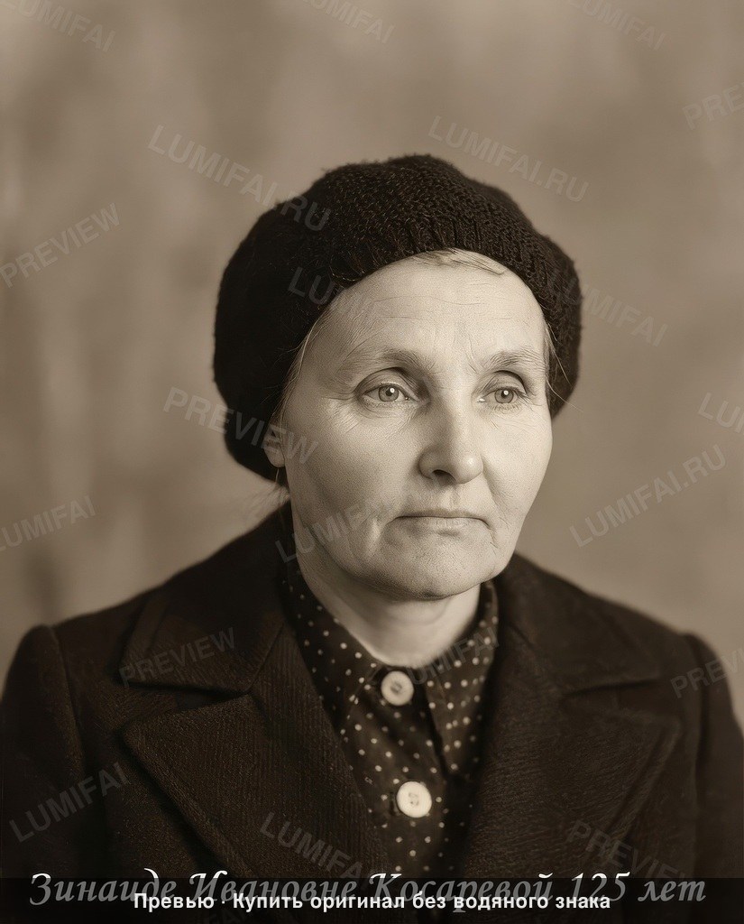 Restore and enhance this photograph to its maximum possible technical quality. The result must look like a sharp modern high-quality scan of a perfectly preserved original — crisp, noise-free, full of detail — while every person, object, and composition remains completely unchanged. Maintain the original warm sepia monochrome tonal character exactly as it appears. Apply uniform sharpening and noise reduction to the entire background. Remove the prominent vertical creases, heavy fold lines at the top, and all chemical stains or paper texture. Recover the deep shadows of the environment behind the subject, ensuring the background is crystal clear and razor-sharp without any artificial blur. Sharpen the foreground elements, specifically the white Cyrillic text at the bottom: "Зинаиде Ивановне Косаревой 125 лет". The text must be rendered in a crisp, high-resolution font that matches the original placement. Repair the horizontal crack and ink loss running through the bottom-right corner of the image. Focus on the clothing textures: apply maximum sharpening to the dark coat, the knit texture of the beret, and the individual dots and buttons of the patterned shirt. The fabric weave and fine threads must be visible and distinct. Apply IDENTICAL sharpness to background, clothing, AND faces. Background must be as sharp and detailed as any face. Blurry background = critical failure. Enhance face sharpness and remove noise like everywhere else. Remove any scratches. But DO NOT alter facial structure, expression, identity, or proportions. Preserve skin texture — pores, fine lines, natural imperfections. Do NOT smooth to plastic. The person must look identical — just sharper and cleaner. Recover the glint in the eyes and the specific definition of the eyelids and lips. Every area must be equally sharp. Background sharpness = face sharpness. No exceptions. ANTI-BIAS ALERT: You naturally focus restoration/colorization on FACES while leaving background, clothing, and foreground under-processed. This is the #1 quality failure. Consciously counteract this. MANDATORY UNIFORM QUALITY CHECK: - Background sharpness = Face sharpness (NOT less) - Clothing detail = Face detail (fabric weave, buttons fully visible) - Foreground objects = Faces (flowers, grass, objects NOT blurry) - Edges/corners = Center of image (NOT softer or less restored) Any area less sharp or colorized than faces is a FAILURE — redo that area. ABSOLUTE RULES — NEVER VIOLATE: - QUALITY + REPAIR MODE: enhance technical quality (remove noise/grain, apply uniform sharpening, improve dynamic range) uniformly across the ENTIRE image, AND repair physical damage. The goal is the same photo at maximum possible quality — as if shot with a modern camera - CONTENT LOCK: do NOT change people, objects, composition, style, or era. Same scene, same identity — just technically better. Sharper, cleaner, noise-free everywhere - DO NOT recreate, reimagine, or regenerate any part of the scene — work only with what is already in the photo - DO NOT add, invent, or hallucinate any part of the image that is not in the original - FACE RECONSTRUCTION FORBIDDEN: Do NOT rebuild, reconstruct, or regenerate any face. Ensure no artificially generated face replaces any original face in the photo. Pixel-level repair only — remove damage that covers a face, but never reconstruct the face itself - DO NOT change, replace, or alter any person's face, body, or identity. 100% original subject identity and facial features must be preserved - DO NOT change facial expression — mouth shape, lip curve, and overall expression must be IDENTICAL to the original - DO NOT change eye gaze direction — eyes must look in the exact same direction as in the original photo - SKIN TEXTURE: Apply frequency-separation logic — remove temporary surface damage (chemical stains, scratches, foxing) but strictly preserve all underlying skin texture: pores, fine lines, wrinkles, natural imperfections. Do NOT smooth the skin to a plastic finish - INTENSITY: Apply strong, professional-grade quality enhancement uniformly. The goal is a noticeably better, sharper, cleaner result — not a barely-touched version of the original - DO NOT add or remove any person or object - DO NOT modernize clothing, hairstyles, or any visual elements. Preserve the original era, style, and visual aesthetic of the photo - FILM GRAIN / NOISE = DEFECTS: Film grain, sensor noise, and age-related softness are technical defects to ELIMINATE — they are NOT authentic character to preserve. Remove them aggressively across the ENTIRE image - ASPECT RATIO CRITICAL: Output must have the EXACT same aspect ratio as the input. DO NOT crop, add borders, expand canvas, or shift composition. Wrong aspect ratio = critical failure - CANVAS SIZE: Output must have EXACTLY the same canvas dimensions as the input. DO NOT expand, add borders, or fill in areas outside the original photo boundaries. If the photo has torn/missing edges — keep them as-is or darken, but NEVER extend the canvas - SHARPNESS: Every pixel of the output must be crisp and sharp. NO softness, NO blur, NO smoothing anywhere. Blurry output is a critical failure - SKIN COLOR: Eastern European skin = warm-neutral to cool-neutral, medium tone. NEVER red or orange. NEVER ghostly pale or washed-out. NEVER airbrushed or plastic. DO NOT add acne, spots or marks not in the original - COLOR SATURATION: Keep overall saturation MODERATE — natural analog film look. NOT vivid digital. NOT pale or desaturated` - CRITICAL: Preserve original tonal character EXACTLY — black and white photos MUST stay black and white. Sepia photos MUST stay sepia. DO NOT add ANY color whatsoever. - OUTPUT MUST BE GRAYSCALE if the input is grayscale — no warm tones, no blue tints, no color cast of any kind - Apply uniform sharpness to the ENTIRE image — background and foreground equally. NO background blur - DO NOT smooth, airbrush, or beautify faces — 