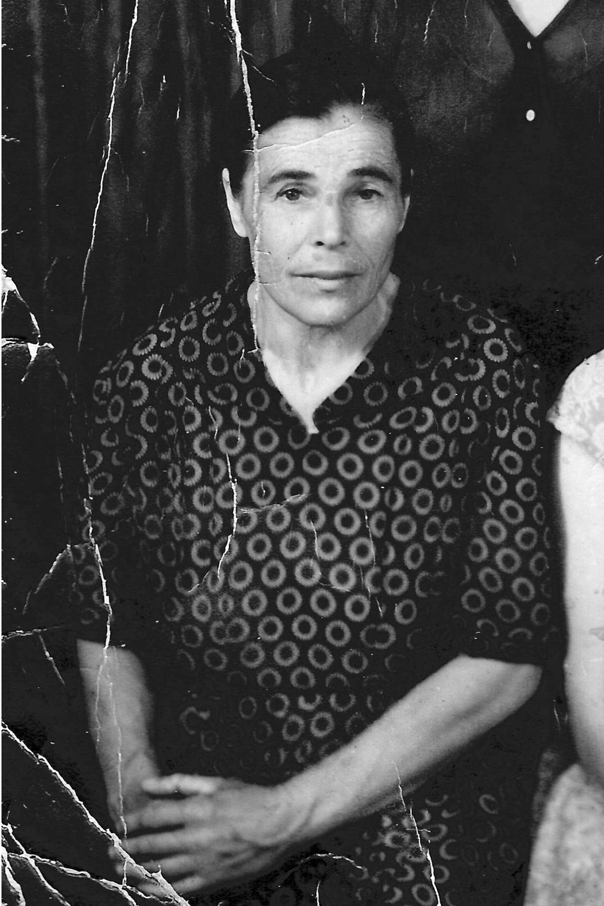 Restore the photograph to remove visible damage including scratches, tears, and folds primarily on the left and right sides, as well as stains and signs of fading throughout. Enhance the image quality by increasing sharpness and micro-detail to define hair strands, fabric texture of the patterned dress, skin pores, and eye detail. Improve the tonal contrast and dynamic range while maintaining the natural texture. Reduce film grain subtly, and recover lost shadow and highlight detail, particularly on the subject's face. Make the face crisp and detailed, highlighting the eyes, lips, and skin texture. Keep the photo in black and white. There is one person in the photo, positioned centrally and facing forward, with dark hair and wearing a patterned dress. The setting appears to be from the mid-20th century. ABSOLUTE RULES — NEVER VIOLATE: - DO NOT add, invent, or hallucinate any part of the image that is not in the original (do not extend cropped areas, do not fill missing parts with invented content) - DO NOT change the framing or composition — if the photo is cropped, keep it cropped exactly the same way - DO NOT add any new damage, folds, creases, tears, dark borders, vignettes, or artifacts - DO NOT colorize — if the photo is black and white, the output must be black and white - DO NOT change, replace, or alter any person's face, body, or identity - DO NOT add or remove any person or object - DO NOT modernize clothing, hairstyles, or any visual elements - ONLY fix what is already damaged — remove existing scratches, tears, stains, fading - Keep the exact same framing, crop, and aspect ratio as the original
