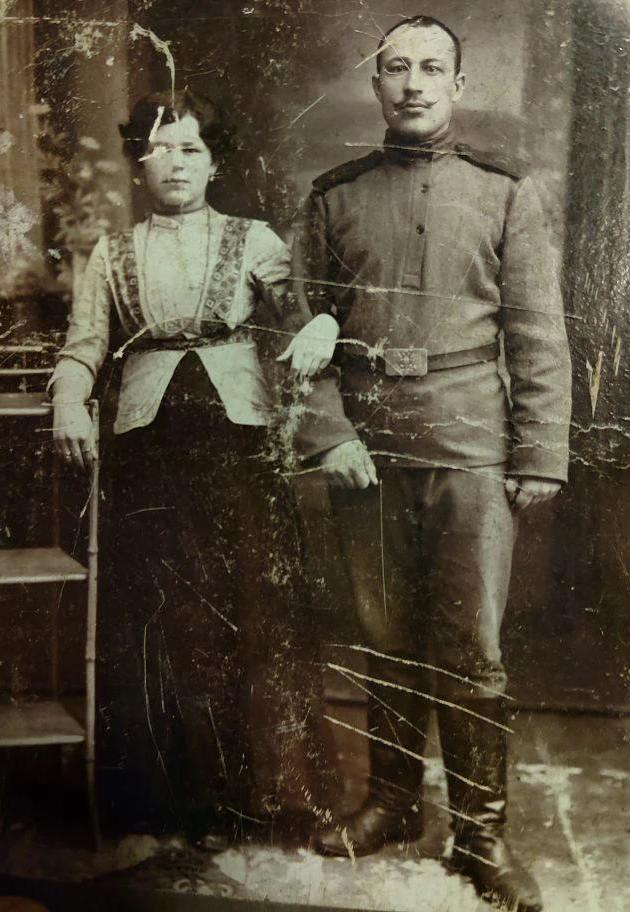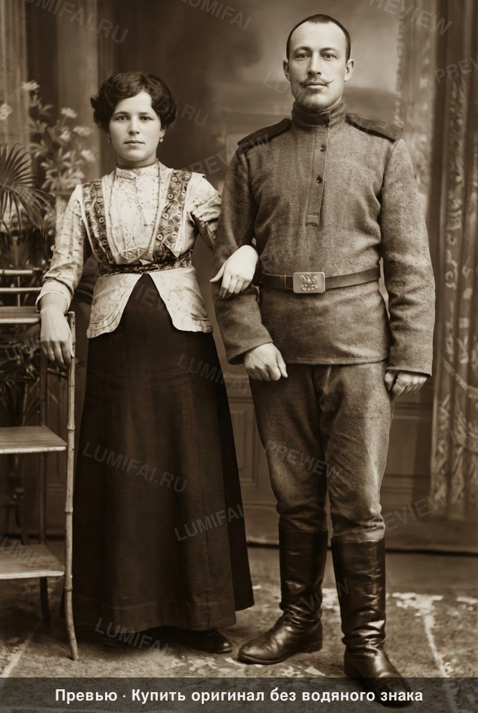 Restore this sepia-toned vintage photograph by first addressing the studio background, removing all white scratches, chemical stains, and surface abrasions from the curtains, wall panels, and the indoor plant to the left; ensure the background remains entirely in focus with sharp, recovered details and consistent tonal depth. In the foreground, reconstruct the wooden shelving unit on the far left and the rug on the floor, removing all dust spots and vertical tears while sharpening the wood grain and carpet fibers to the same level as the subjects. Restore the intricate clothing textures with high-definition micro-detail, specifically the ornate embroidery and patterns on the woman's vest, the delicate fabric of her white blouse, the heavy wool texture of the man's military uniform, the metallic sheen of his belt buckle, and the polished leather surface of his tall boots. Repair all heavy damage at the edges and corners of the frame, including the large white tear marks and frayed borders, ensuring these peripheral areas are processed with the exact same clarity and contrast as the center. Finally, restore the faces of the man and woman by removing the white scratch over the woman's eye and the creases on the man's forehead, maintaining their natural expressions and original sepia tones. Apply IDENTICAL sharpness and restoration quality to background, foreground, clothing, AND faces—no hierarchy. Background textures and architectural details must be as sharp as any face in the image. Foreground objects must be restored to the same quality level as faces. Clothing textures (fabric weave, buttons, collars) must be restored with full micro-detail. CRITICAL: Process all areas with equal quality. Compensate for natural face-bias by applying extra restoration effort to the background, clothing, and foreground objects to achieve a uniform, high-resolution finish across the entire frame. ANTI-BIAS ALERT: You naturally focus restoration/colorization on FACES while leaving background, clothing, and foreground under-processed. This is the #1 quality failure. Consciously counteract this. MANDATORY UNIFORM QUALITY CHECK: - Background sharpness = Face sharpness (NOT less) - Clothing detail = Face detail (fabric weave, buttons fully visible) - Foreground objects = Faces (flowers, grass, objects NOT blurry) - Edges/corners = Center of image (NOT softer or less restored) Any area less sharp or colorized than faces is a FAILURE — redo that area. ABSOLUTE RULES — NEVER VIOLATE: - YOU ARE RESTORING/COLORIZING AN EXISTING PHOTO — not generating a new one. Every pixel must correspond to the original image. - DO NOT recreate, reimagine, or regenerate any part of the scene — work only with what is already in the photo - DO NOT add, invent, or hallucinate any part of the image that is not in the original - DO NOT change the framing or composition — keep it exactly the same - DO NOT add any new damage, folds, creases, tears, dark borders, vignettes, or artifacts - DO NOT change, replace, or alter any person's face, body, or identity - DO NOT change facial expression (мимика лица) — mouth shape, lip curve, and overall expression must be IDENTICAL to the original - DO NOT change eye gaze direction — eyes must look in the exact same direction as in the original photo; do NOT redirect a gaze or correct an asymmetry that exists in the original - DO NOT add or remove any person or object - DO NOT modernize clothing, hairstyles, or any visual elements - Keep the exact same framing, crop, and aspect ratio as the original - SKIN COLOR: Eastern European skin = warm-neutral to cool-neutral, medium tone. NEVER red or orange. NEVER ghostly pale or washed-out. NEVER airbrushed or plastic. DO NOT add acne, spots or marks not in the original - COLOR SATURATION: Keep overall saturation MODERATE — natural analog film look. NOT vivid digital. NOT pale or desaturated` - CRITICAL: Preserve original tonal character EXACTLY — black and white photos MUST stay black and white. Sepia photos MUST stay sepia. DO NOT add ANY color whatsoever. - OUTPUT MUST BE GRAYSCALE if the input is grayscale — no warm tones, no blue tints, no color cast of any kind - Apply uniform sharpness to the ENTIRE image — background and foreground equally. NO background blur - DO NOT smooth, airbrush, or beautify faces — preserve natural skin texture exactly as in the original