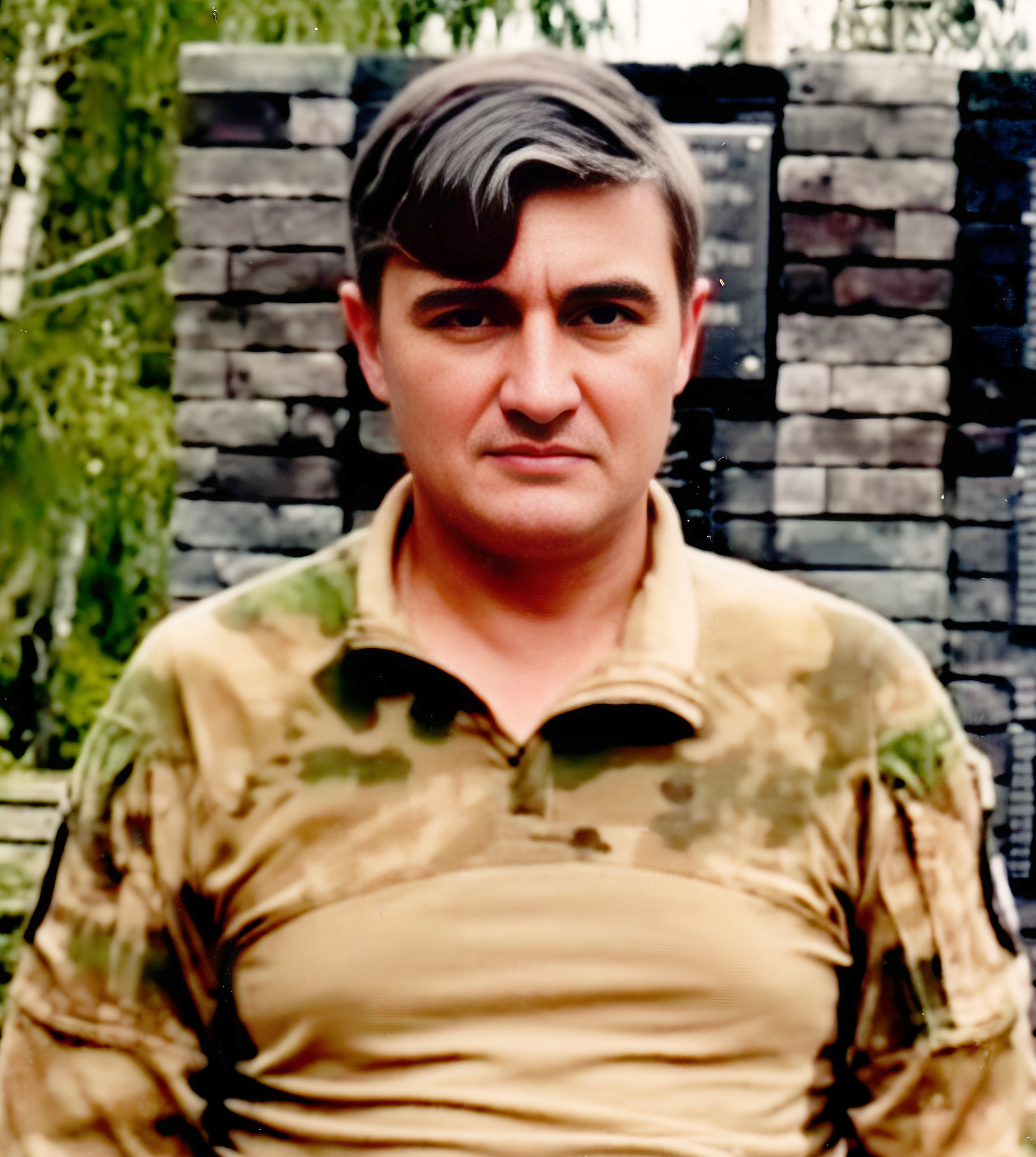 Apply uniform technical enhancement to this scanned image — treat every pixel region identically regardless of content. DO NOT use face detection, face restoration, or face-specific enhancement algorithms. Faces are NOT special regions — treat them exactly like walls, sky, furniture, or any background element. The enhancement quality must be identical across faces, background, clothing, and all other areas. Sharpen, denoise, and recover full detail in the brick wall pillar, the plaque with text, and the lush green trees and foliage in the background. Every individual brick edge, mortar line, and leaf must be as crisp as any face. Eliminate all chromatic aberration around the foliage and sharpen the plaque's text to maximum legibility. In the foreground, sharpen and denoise the tactical camouflage clothing. Recover the specific fabric weave, the heavy stitching on the shoulder pockets, and the tactile texture of the camouflage pattern. Every crease and shadow in the fabric must be rendered with high-frequency detail and zero noise. Repair all edges and corners of the frame, ensuring the sharpening is consistent to the very perimeter of the image. Remove all physical damage including the white dust specks on the subject's hair and right shoulder, the small black spots on the right side of the brick wall, and the vertical compression noise artifacts throughout the image. Inpaint any missing data using surrounding texture context. For faces: apply the EXACT SAME sharpening and denoising as the background and clothing — no more. DO NOT use face restoration, face upscaling, or face enhancement. Faces are just another region of the image — treat them as you would a textured wall. Do NOT alter facial structure, expression, identity, or proportions. Remove any damage by inpainting from context only. Preserve skin texture — pores, fine lines, natural imperfections. Output must have the EXACT same aspect ratio as the input. Do not expand, crop, or add borders. Do not expand the canvas. Do not fill in areas outside the original photo. Preserve the original color balance and lighting environment. Every area must be equally sharp and clean. Blurry background or unsharp clothing = critical failure. No area is more important than any other. ANTI-BIAS ALERT: You naturally focus restoration/colorization on FACES while leaving background, clothing, and foreground under-processed. This is the #1 quality failure. Consciously counteract this. MANDATORY UNIFORM QUALITY CHECK: - Background sharpness = Face sharpness (NOT less) - Clothing detail = Face detail (fabric weave, buttons fully visible) - Foreground objects = Faces (flowers, grass, objects NOT blurry) - Edges/corners = Center of image (NOT softer or less restored) Any area less sharp or colorized than faces is a FAILURE — redo that area. ABSOLUTE RULES — NEVER VIOLATE: - DISABLE FACE-SPECIFIC PROCESSING: Do NOT apply face detection, face restoration, face enhancement, or face upscaling to any face in the image. Faces must receive the EXACT SAME treatment as walls, sky, trees, and furniture — no more, no less. Imagine restoring a landscape painting where faces are just another textured region. - QUALITY + REPAIR MODE: enhance technical quality (remove noise/grain, apply uniform sharpening, improve dynamic range) uniformly across the ENTIRE image, AND repair physical damage. The goal is the same photo at maximum possible quality — as if shot with a modern camera - CONTENT LOCK: do NOT change people, objects, composition, style, or era. Same scene, same identity — just technically better. Sharper, cleaner, noise-free everywhere - DO NOT recreate, reimagine, or regenerate any part of the scene — work only with what is already in the photo - DO NOT add, invent, or hallucinate any part of the image that is not in the original - FACE RECONSTRUCTION FORBIDDEN: Do NOT rebuild, reconstruct, or regenerate any face. Ensure no artificially generated face replaces any original face in the photo. Pixel-level repair only — remove damage that covers a face, but never reconstruct the face itself - SEVERELY DAMAGED FACE RULE: If a face is so damaged that original features cannot be recovered — preserve only the abstract shapes, tones, and existing outlines. DO NOT generate, imagine, or invent what the face might look like. It is better to show a blurry or partially damaged face than to show a different person's face. - WRONG IDENTITY = CRITICAL FAILURE: If the output shows a different person than the input, or a face that was generated/invented by AI, the result is completely unacceptable. A partially damaged original face is always better than a perfect AI-generated replacement face. - DO NOT change, replace, or alter any person's face, body, or identity. 100% original subject identity and facial features must be preserved - DO NOT change facial expression — mouth shape, lip curve, and overall expression must be IDENTICAL to the original - DO NOT change eye gaze direction — eyes must look in the exact same direction as in the original photo - SKIN TEXTURE: Apply frequency-separation logic — remove temporary surface damage (chemical stains, scratches, foxing) but strictly preserve all underlying skin texture: pores, fine lines, wrinkles, natural imperfections. Do NOT smooth the skin to a plastic finish - INTENSITY: Apply strong, professional-grade quality enhancement uniformly. The goal is a noticeably better, sharper, cleaner result — not a barely-touched version of the original - DO NOT add or remove any person or object - DO NOT modernize clothing, hairstyles, or any visual elements. Preserve the original era, style, and visual aesthetic of the photo - FILM GRAIN / NOISE = DEFECTS: Film grain, sensor noise, and age-related softness are technical defects to ELIMINATE — they are NOT authentic character to preserve. Remove them aggressively across the ENTIRE image - ASPECT RATIO CRITICAL: Output must have the EXACT same aspect ratio as