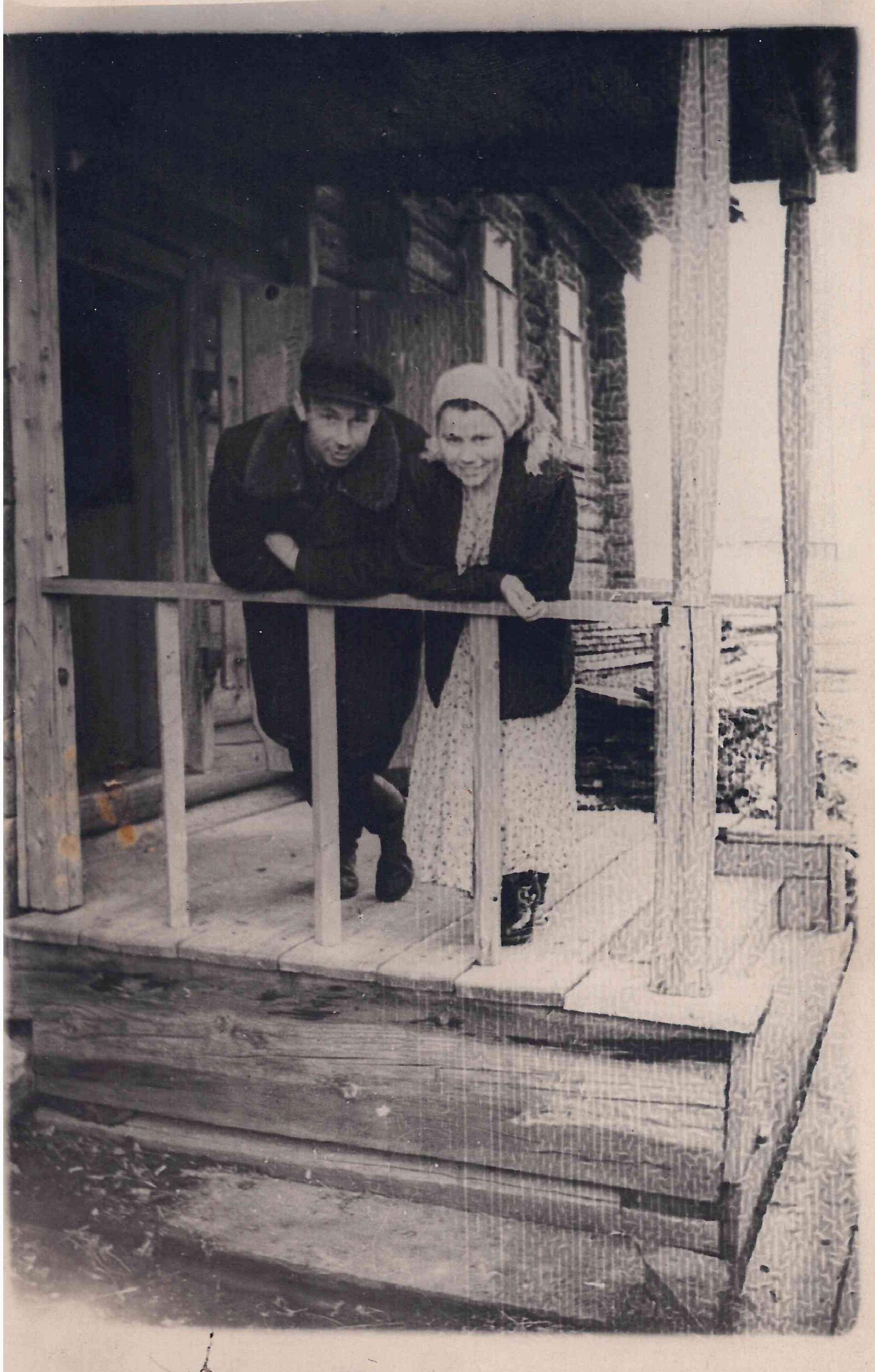 Restore and enhance this photograph to its maximum possible technical quality. The result must look like a sharp modern high-quality scan of a perfectly preserved original — crisp, noise-free, full of detail — while every person, object, and composition remains completely unchanged. Apply IDENTICAL sharpness to background, clothing, AND faces. Background must be as sharp and detailed as any face. Blurry background = critical failure. First, restore the background environment: Clean and sharpen the wooden log siding of the house, the window frames, and the dark doorway. Recover the grain of the wood panels and the texture of the porch roof. Apply high-contrast sharpening to the vertical wooden porch posts and the surrounding ground. Remove the orange chemical stains on the left banister post and the white dust specs across the upper dark areas. Next, enhance the foreground objects: The wooden porch floorboards and the railing must be rendered with high-definition texture, showing distinct wood grain and sharp edges. Recover shadow detail underneath the porch and behind the figures. Remove all fine scratches, white spots, and the vertical crease on the right side of the image. Focus on the clothing: Sharpen the heavy wool texture of the man’s dark coat and the fur-like collar. Enhance the intricate floral or speckled pattern of the woman’s dress and the knit texture of her headscarf. Every button, seam, and fabric fold must be rendered with modern digital clarity. Repair all edges and corners: Fix the bent corners and the white frayed bottom edge of the physical print. Inpaint the missing information at the very bottom where the paper is damaged. Enhance face sharpness and remove noise like everywhere else. Remove any scratches. But DO NOT alter facial structure, expression, identity, or proportions. Preserve skin texture — pores, fine lines, natural imperfections. Do NOT smooth to plastic. The person must look identical — just sharper and cleaner. Keep the original desaturated, slightly sepia-toned black and white palette. Every area must be equally sharp. Background sharpness = face sharpness. No exceptions. ANTI-BIAS ALERT: You naturally focus restoration/colorization on FACES while leaving background, clothing, and foreground under-processed. This is the #1 quality failure. Consciously counteract this. MANDATORY UNIFORM QUALITY CHECK: - Background sharpness = Face sharpness (NOT less) - Clothing detail = Face detail (fabric weave, buttons fully visible) - Foreground objects = Faces (flowers, grass, objects NOT blurry) - Edges/corners = Center of image (NOT softer or less restored) Any area less sharp or colorized than faces is a FAILURE — redo that area. ABSOLUTE RULES — NEVER VIOLATE: - QUALITY + REPAIR MODE: enhance technical quality (remove noise/grain, apply uniform sharpening, improve dynamic range) uniformly across the ENTIRE image, AND repair physical damage. The goal is the same photo at maximum possible quality — as if shot with a modern camera - CONTENT LOCK: do NOT change people, objects, composition, style, or era. Same scene, same identity — just technically better. Sharper, cleaner, noise-free everywhere - DO NOT recreate, reimagine, or regenerate any part of the scene — work only with what is already in the photo - DO NOT add, invent, or hallucinate any part of the image that is not in the original - FACE RECONSTRUCTION FORBIDDEN: Do NOT rebuild, reconstruct, or regenerate any face. Ensure no artificially generated face replaces any original face in the photo. Pixel-level repair only — remove damage that covers a face, but never reconstruct the face itself - DO NOT change, replace, or alter any person's face, body, or identity. 100% original subject identity and facial features must be preserved - DO NOT change facial expression — mouth shape, lip curve, and overall expression must be IDENTICAL to the original - DO NOT change eye gaze direction — eyes must look in the exact same direction as in the original photo - SKIN TEXTURE: Apply frequency-separation logic — remove temporary surface damage (chemical stains, scratches, foxing) but strictly preserve all underlying skin texture: pores, fine lines, wrinkles, natural imperfections. Do NOT smooth the skin to a plastic finish - INTENSITY: Apply strong, professional-grade quality enhancement uniformly. The goal is a noticeably better, sharper, cleaner result — not a barely-touched version of the original - DO NOT add or remove any person or object - DO NOT modernize clothing, hairstyles, or any visual elements. Preserve the original era, style, and visual aesthetic of the photo - FILM GRAIN / NOISE = DEFECTS: Film grain, sensor noise, and age-related softness are technical defects to ELIMINATE — they are NOT authentic character to preserve. Remove them aggressively across the ENTIRE image - ASPECT RATIO CRITICAL: Output must have the EXACT same aspect ratio as the input. DO NOT crop, add borders, expand canvas, or shift composition. Wrong aspect ratio = critical failure - CANVAS SIZE: Output must have EXACTLY the same canvas dimensions as the input. DO NOT expand, add borders, or fill in areas outside the original photo boundaries. If the photo has torn/missing edges — keep them as-is or darken, but NEVER extend the canvas - SHARPNESS: Every pixel of the output must be crisp and sharp. NO softness, NO blur, NO smoothing anywhere. Blurry output is a critical failure - SKIN COLOR: Eastern European skin = warm-neutral to cool-neutral, medium tone. NEVER red or orange. NEVER ghostly pale or washed-out. NEVER airbrushed or plastic. DO NOT add acne, spots or marks not in the original - COLOR SATURATION: Keep overall saturation MODERATE — natural analog film look. NOT vivid digital. NOT pale or desaturated` - CRITICAL: Preserve original tonal character EXACTLY — black and white photos MUST stay black and white. Sepia photos MUST stay sepia. DO NOT add ANY color whatsoever. - OUTPUT MUST BE G