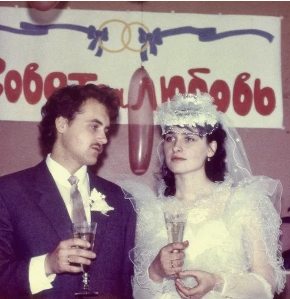 ```plaintext Photo shows two people, a man on the left and a woman on the right, both holding glasses in a wedding setting with a Cyrillic banner behind them. The image is likely from the 1980s, indicated by their clothing style. Significant scratches, stains, and fading are present throughout the photo, notably on the man’s suit and background area. 1. RESTORE: - Remove all scratches, tears, folds, stains, fading, and mold across the entire photo. - Remove visible dust spots on the man's suit and the banner. 2. ENHANCE QUALITY: - Apply uniform sharpness throughout, ensuring equal focus on faces, clothing, background, and text. - Improve tonal contrast and dynamic range across entire frame to bring out details in the wedding attire and banner. - Reduce film grain while maintaining a natural film texture. - Recover lost shadow details in the darker areas of the clothing and highlight details in the wedding dress and veil. Preserve original sepia tone, maintaining its warmth to retain the vintage character of the image. ``` ABSOLUTE RULES — NEVER VIOLATE: - DO NOT add, invent, or hallucinate any part of the image that is not in the original - DO NOT change the framing or composition — keep it exactly the same - DO NOT add any new damage, folds, creases, tears, dark borders, vignettes, or artifacts - DO NOT change, replace, or alter any person's face, body, or identity - DO NOT add or remove any person or object - DO NOT modernize clothing, hairstyles, or any visual elements - Keep the exact same framing, crop, and aspect ratio as the original - Preserve original tonal character: sepia stays sepia, black and white stays black and white - Apply uniform sharpness to the ENTIRE image — background and foreground equally. NO background blur