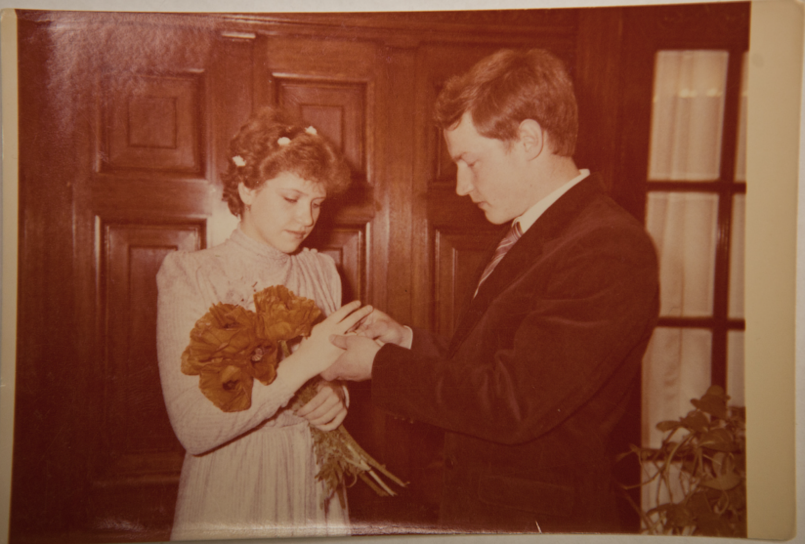 Restore and enhance the following photograph: There are two people in the photo. The first is a woman on the left, wearing a long, light-colored dress with a floral headpiece and holding a bouquet of orange flowers. The second person is a man on the right, dressed in a dark suit and tie, placing a ring on the woman’s finger. The setting appears to be an indoor venue with wooden paneling in the background, suggesting an event from the 1970s or 1980s. Please restore the image by removing all physical damage, including scratches, fading, and dust spots. Specifically, there are visible scratches across the lower part of the photo, some fading on the woman’s face, and a couple of dust spots on the left side. Enhance the quality of the entire image uniformly: sharpen all elements, ensuring the background, the couple, clothing, and floral arrangements are all equally clear. Improve tonal contrast and dynamic range thoroughly across the photo, recovering detail in both shadows and highlights. Reduce the noticeable film grain while maintaining a natural film texture. Importantly, preserve the original sepia tone as it is, ensuring that warmth is retained and the historical character of the photograph is kept intact. ABSOLUTE RULES — NEVER VIOLATE: - DO NOT add, invent, or hallucinate any part of the image that is not in the original - DO NOT change the framing or composition — keep it exactly the same - DO NOT add any new damage, folds, creases, tears, dark borders, vignettes, or artifacts - DO NOT change, replace, or alter any person's face, body, or identity - DO NOT add or remove any person or object - DO NOT modernize clothing, hairstyles, or any visual elements - Keep the exact same framing, crop, and aspect ratio as the original - Preserve original tonal character: sepia stays sepia, black and white stays black and white - Apply uniform sharpness to the ENTIRE image — background and foreground equally. NO background blur