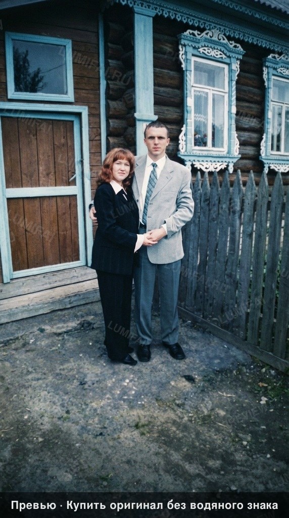 Perform a high-fidelity restoration and uniform enhancement of this late-20th-century color photograph. The image features a young couple standing outside a traditional wooden house with ornate light-blue window trim and a picket fence. The woman on the left has reddish-brown hair and is wearing a dark suit; the man on the right has short dark hair and is wearing a light-grey blazer, a white shirt, a patterned tie, and dark trousers. RESTORATION OF DAMAGE: - Remove all physical degradation, including the heavy brown and green mold/stain spots concentrated on the left door, the picket fence, and the ground. - Eliminate the bright cyan/blue scribbles and light leaks in the bottom-left foreground. - Repair the white tear/puncture at the top-center edge of the frame. - Fix all dust spots, fine scratches, and the chemical fading affecting the bottom half of the image. UNIFORM QUALITY ENHANCEMENT: - Apply EQUAL sharpening and detail recovery across the entire frame. Ensure the wooden planks of the house, the intricate carvings of the window trim, the texture of the picket fence, and the rough ground in the foreground are just as sharp and detailed as the faces. - DO NOT use background blur; maintain a deep depth-of-field where the background architecture and the people are in crisp focus. - Enhance the textures of the clothing: clarify the weave of the man's blazer, the pattern of his tie, and the fabric of the woman's dark suit. - Improve dynamic range by recovering shadow details in the doorway and highlight details in the white window frames. - Reduce film grain while preserving the original 1990s color palette, maintaining the natural saturation and the specific blue/brown tonal character of the original film stock. FINAL OUTPUT: A clean, vibrant, and uniformly sharp professional-grade restoration where every pixel—from the edges and corners to the center—exhibits the same high level of clarity and detail. ABSOLUTE RULES — NEVER VIOLATE: - DO NOT add, invent, or hallucinate any part of the image that is not in the original - DO NOT change the framing or composition — keep it exactly the same - DO NOT add any new damage, folds, creases, tears, dark borders, vignettes, or artifacts - DO NOT change, replace, or alter any person's face, body, or identity - DO NOT add or remove any person or object - DO NOT modernize clothing, hairstyles, or any visual elements - Keep the exact same framing, crop, and aspect ratio as the original - UNIFORM QUALITY: Process the ENTIRE image with equal attention — foreground flowers/textures, background elements, and edges must have the SAME sharpness and detail as faces. Do NOT leave any area blurry, simplified, or less detailed than another - SKIN COLOR: Eastern European skin = pale/medium, cool-neutral tone. NEVER red, orange, or overly warm. NEVER airbrushed or plastic - COLOR SATURATION: Keep overall saturation LOW TO MODERATE — muted analog film look, NOT vivid digital colors` - Preserve original tonal character: sepia stays sepia, black and white stays black and white - Apply uniform sharpness to the ENTIRE image — background and foreground equally. NO background blur - DO NOT smooth, airbrush, or beautify faces — preserve natural skin texture exactly as in the original