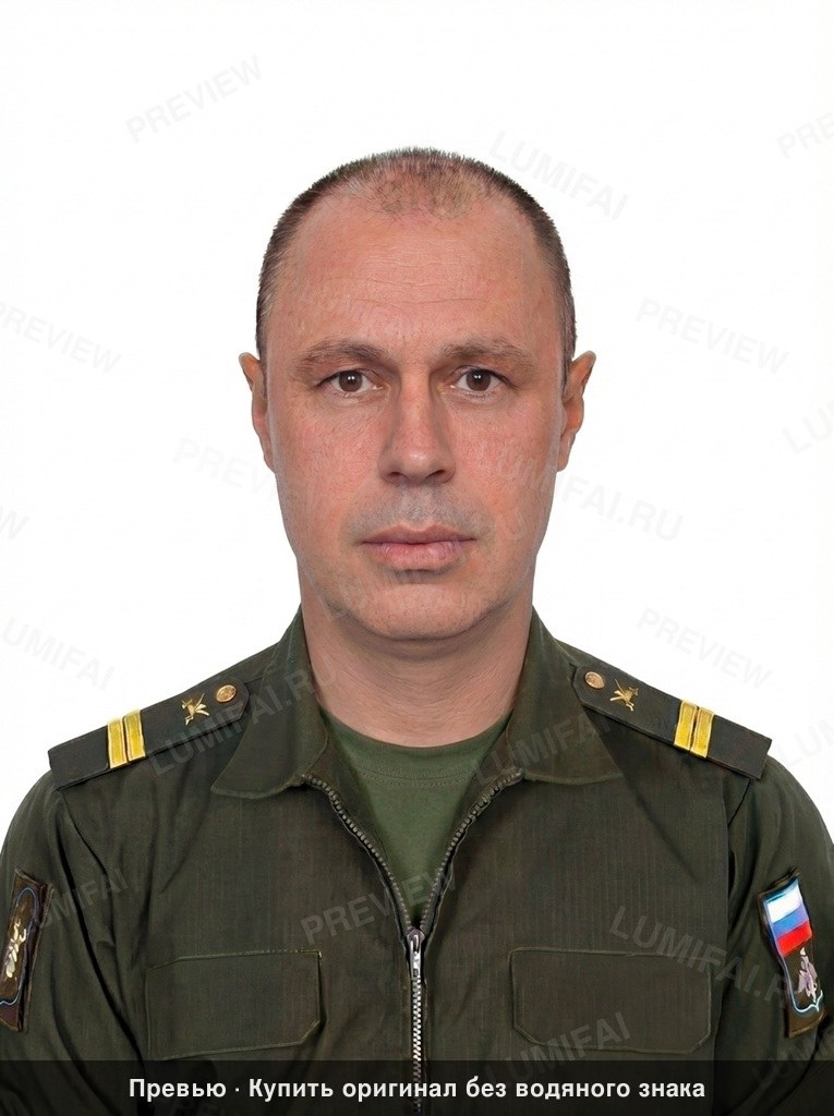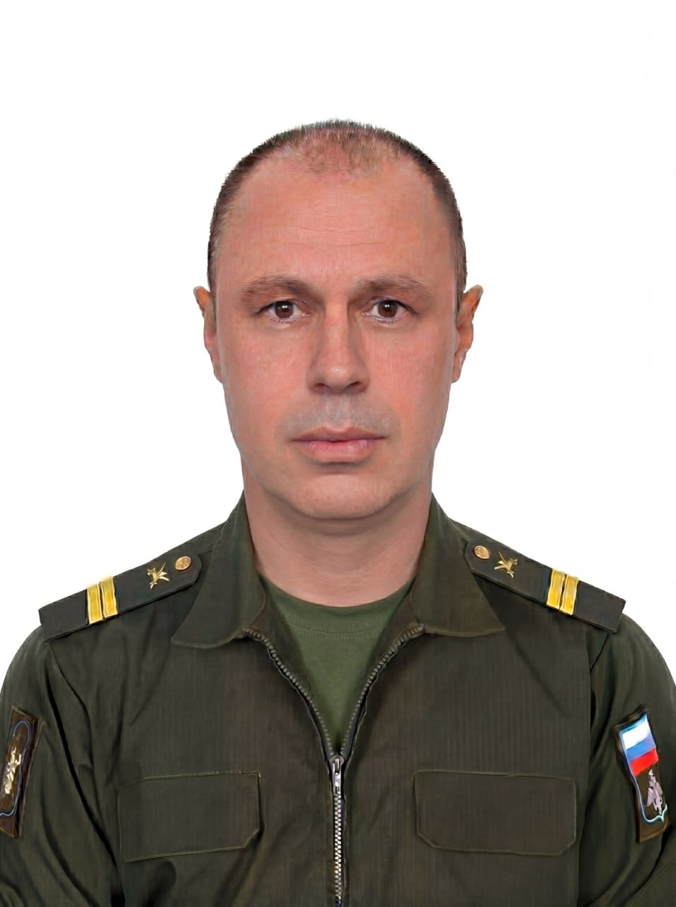 Professionally restore and high-definition enhance this formal military portrait of a middle-aged man with short, thinning hair and brown eyes. The subject is wearing an olive-drab Russian military utility uniform featuring shoulder boards with two yellow stripes/pins and a tactical patch with the Russian flag and crest on his left arm. RESTORATION AND UNIFORM SHARPNESS MANDATE: - Eliminate all digital artifacts, compression noise, and slight blurring present across the entire image. - Apply UNIFORM, high-fidelity sharpening across the WHOLE frame. Every pixel must receive equal enhancement quality. - CLOTHING DETAIL: Deeply enhance the texture of the olive-drab fabric, the metallic shine of the zipper teeth, the fine embroidery of the arm patches, and the crispness of the shoulder board insignia. Do not let the clothing appear smoother or less detailed than the face. - FACIAL DETAIL: Regenerate skin pores and fine lines with natural realism, but ensure the sharpness matches the surrounding uniform perfectly. - EDGES AND PERIPHERY: Ensure the bottom corners of the chest pockets and the literal edges of the uniform are as sharp and detailed as the eyes. - BACKGROUND: Maintain the clean, solid white background but ensure the transition between the subject's hair/uniform and the white space is razor-sharp with no "haloing" or fuzziness. QUALITY ENHANCEMENTS: - Improve dynamic range to recover subtle shadow details in the folds of the sleeves and highlights on the forehead. - Balance tonal contrast to make the olive-green pop while keeping the skin tones natural and professional. - Preserve the original color palette exactly—do not shift the olive-drab or skin warmth. - Deliver a final result that looks like a modern, ultra-high-resolution RAW digital photograph with zero depth-of-field blur; everything from the zipper to the ears must be in pin-sharp focus. ABSOLUTE RULES — NEVER VIOLATE: - DO NOT add, invent, or hallucinate any part of the image that is not in the original - DO NOT change the framing or composition — keep it exactly the same - DO NOT add any new damage, folds, creases, tears, dark borders, vignettes, or artifacts - DO NOT change, replace, or alter any person's face, body, or identity - DO NOT add or remove any person or object - DO NOT modernize clothing, hairstyles, or any visual elements - Keep the exact same framing, crop, and aspect ratio as the original - UNIFORM QUALITY: Process the ENTIRE image with equal attention — foreground flowers/textures, background elements, and edges must have the SAME sharpness and detail as faces. Do NOT leave any area blurry, simplified, or less detailed than another - SKIN COLOR: Eastern European skin = pale/medium, cool-neutral tone. NEVER red, orange, or overly warm. NEVER airbrushed or plastic - COLOR SATURATION: Keep overall saturation LOW TO MODERATE — muted analog film look, NOT vivid digital colors` - Preserve original tonal character: sepia stays sepia, black and white stays black and white - Apply uniform sharpness to the ENTIRE image — background and foreground equally. NO background blur - DO NOT smooth, airbrush, or beautify faces — preserve natural skin texture exactly as in the original