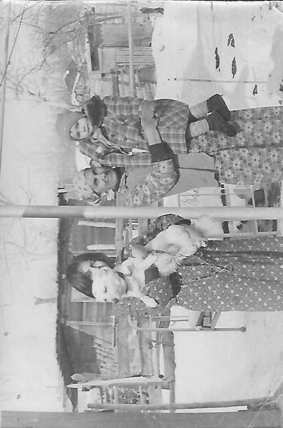{"prompt":"Restore and enhance this vintage photograph from the mid-20th century, depicting three people in a snowy outdoor setting. The individuals are arranged vertically due to the photo orientation: at the top, a person wearing a winter cap and patterned winter clothing holds a child dressed in checkered clothing. Below them, another adult holds a small dog, dressed in similar winter attire.\n\n1. RESTORE:\n - Remove visible scratches and tears predominantly on the upper right and central areas.\n - Eliminate stains and fading present across the upper left corner.\n - Clear mold and dust spots scattered throughout the image, especially near the edges.\n\n2. ENHANCE QUALITY:\n - Sharpen the entire image uniformly, ensuring the background, trees, ground, clothing, faces, and all elements are equally sharp.\n - Maintain a flat film photo style; do not introduce depth-of-field or background blur.\n - Improve tonal contrast and dynamic range across the frame.\n - Reduce film grain while preserving the natural texture of the film.\n - Recover and enhance lost details in shadows and highlights.\n - Ensure to retain the sepia tonal character of the photo, preserving its warm vintage aesthetics.\n\nOutput a clear, restored, and enhanced image that maintains the historical and emotional integrity of the original photograph."}